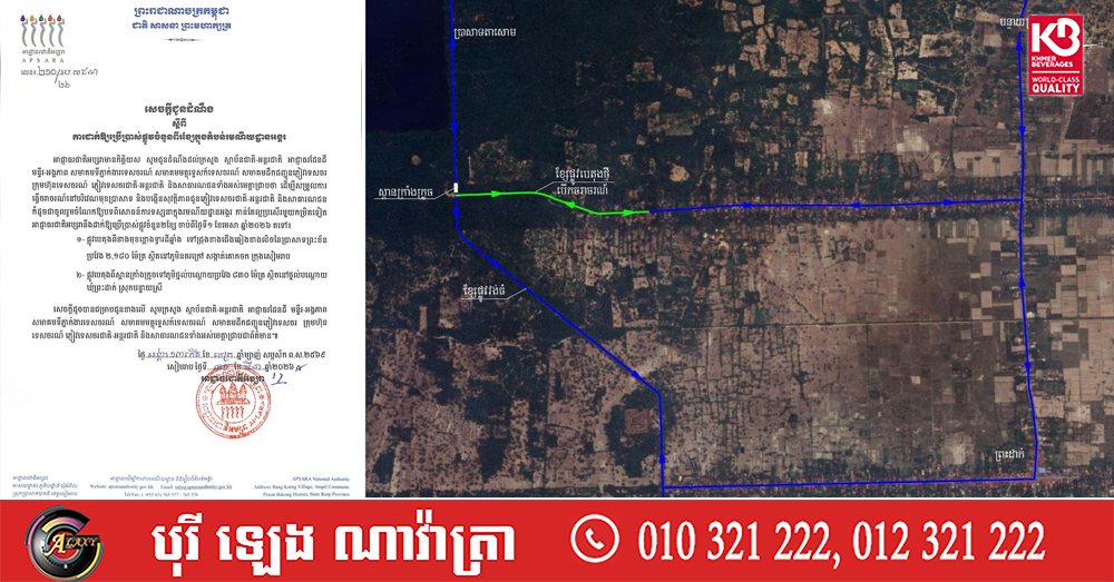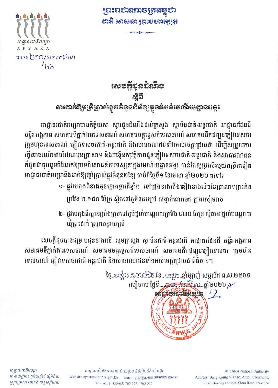 (សៀមរាប)៖ អាជ្ញាធរជាតិអប្សរា នៅថ្ងៃទី៣១ ខែមីនា ឆ្នាំ២០២៦នេះ បានចេញសេចក្តីជូនដំណឹង ស្តីពីការដាក់ឱ្យប្រើប្រាស់ផ្លូវចំនួនពីរខ្សែ ក្នុងតំបន់រមណីយដ្ឋានអង្គរ ចាប់ពីថ្ងៃទី១ ខែមេសា ឆ្នាំ២០២៦ តទៅ។