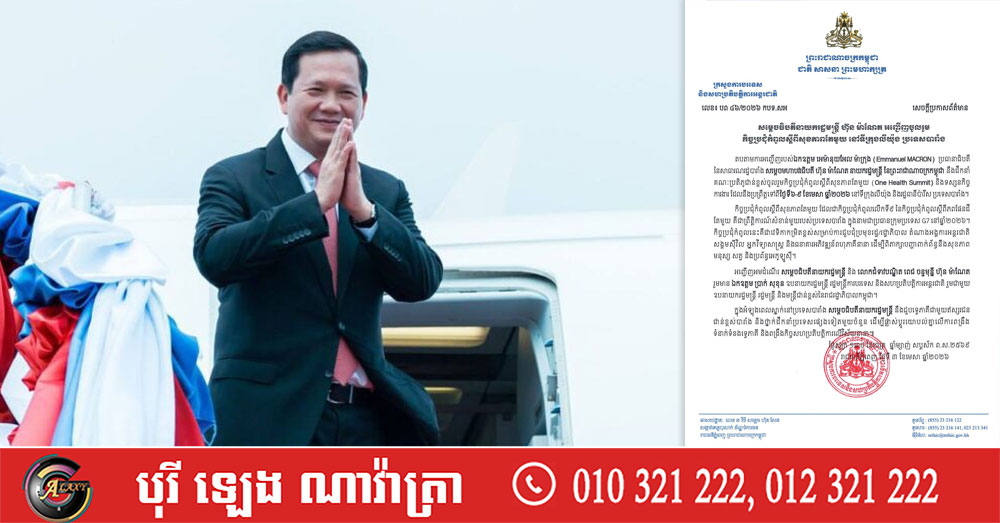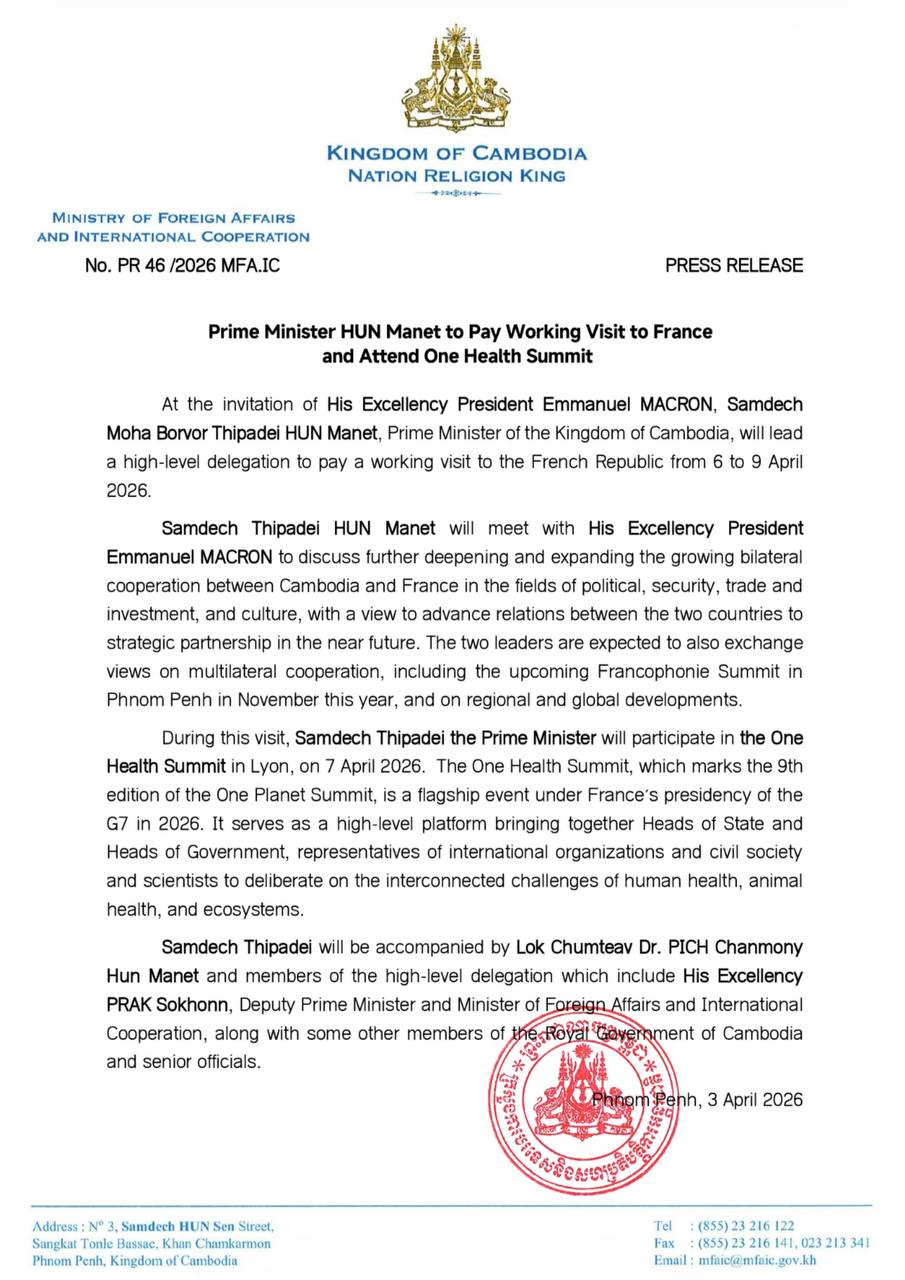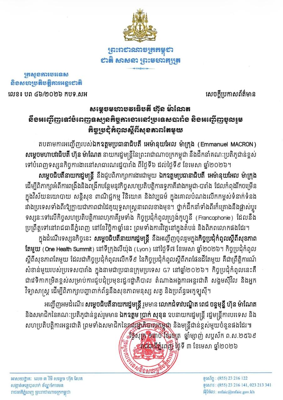 (ភ្នំពេញ)៖ យោងតាមសេចក្ដីប្រកាសព័ត៌មានរបស់ក្រសួងការបរទេស និងសហប្រតិបត្តិការអន្តរជាតិ នៅថ្ងៃទី៣ ខែមេសា ឆ្នាំ២០២៦ បានឱ្យដឹងថា តបតាមការអញ្ជើញរបស់លោក អេម៉ានុយអែល ម៉ាក្រុង (Emmanuel MACRON) ប្រធានាធិបតី នៃសាធារណរដ្ឋបារាំង សម្តេចមហាបវរធិបតី ហ៊ុន ម៉ាណែត នាយករដ្ឋមន្ត្រី នៃព្រះរាជាណាចក្រកម្ពុជា នឹងដឹកនាំ គណៈប្រតិភូជាន់ខ្ពស់ចូលរួមកិច្ចប្រជុំកំពូលស្តីពីសុខភាពតែមួយ (One Health Summit) និងទស្សនកិច្ច ការងារ ដែលនឹងប្រព្រឹត្តទៅពីថ្ងៃទី៦-៩ ខែមេសា ឆ្នាំ២០២៦ នៅទីក្រុងលីយ៉ុង និងរដ្ឋធានីប៉ារីស ប្រទេសបារាំង។