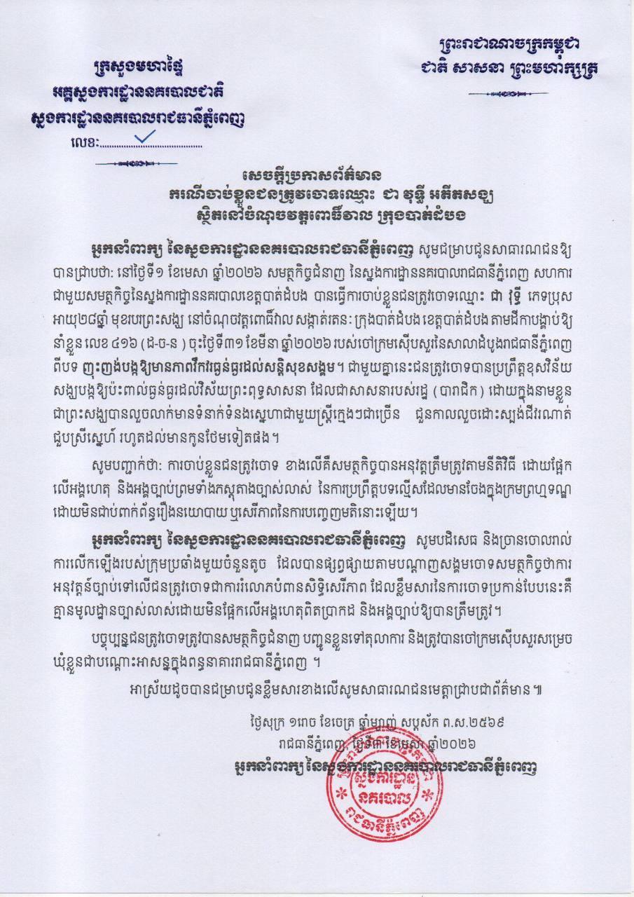 អ្នកនាំពាក្យនៃស្នងការដ្ឋាននគរបាលរាជធានីភ្នំពេញ បានឲ្យដឹងថា នៅថ្ងៃទី១ ខែមេសា ឆ្នាំ២០២៦ សមត្ថកិច្ចជំនាញ នៃស្នងការដ្ឋាននគរបាលរាជធានីភ្នំពេញ សហការ ជាមួយសមត្ថកិច្ចនៃស្នងការដ្ឋាននគរបាលខេត្តបាត់ដំបង បានធ្វើការចាប់ខ្លួនជនត្រូវចោទឈ្មោះ ជា វុទ្ធី ភេទប្រុស អាយុ២៨ឆ្នាំ មុខរបរព្រះសង្ឃ នៅចំណុចវត្តពោធិ៍វាល សង្កាត់រតនៈ ក្រុងបាត់ដំបង ខេត្តបាត់ដំបង តាមដីកាបង្គាប់ឱ្យនាំខ្លួនលេខ ៤១៦ (ដ-ច-ន) ចុះថ្ងៃទី៣១ ខែមីនា ឆ្នាំ២០២៦ របស់ចៅក្រមស៊ើបសួរនៃសាលាដំបូងរាជធានីភ្នំពេញ ពីបទ ញុះញង់បង្កឱ្យមានភាពវឹកវរធ្ងន់ធ្ងរដល់សន្តិសុខសង្គម។