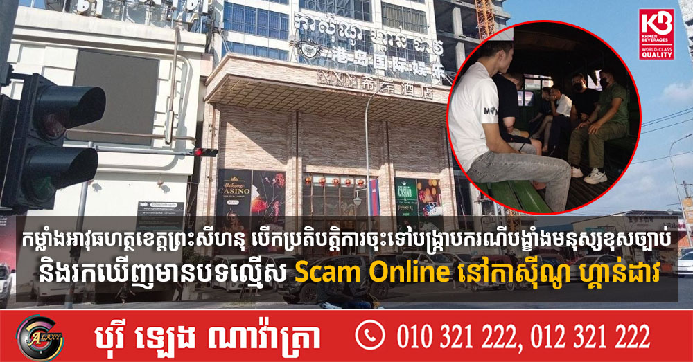 កម្លាំងអាវុធហត្ថខេត្តព្រះសីហនុ បើកប្រតិបត្តិការចុះទៅបង្ក្រាបករណីបង្ខាំងមនុស្សខុសច្បាប់ និងរកឃើញមានបទល្មើស Scam Online នៅកាស៊ីណូ ហ្គាន់ដាវ