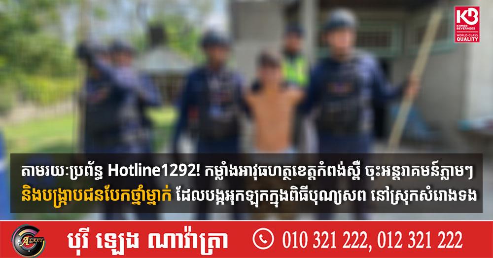 តាមរយៈប្រព័ន្ធ Hotline1292! កម្លាំងអាវុធហត្ថខេត្តកំពង់ស្ពឺ ចុះអន្តរាគមន៍ភ្លាមៗ និងបង្ក្រាបជនបែកថ្នាំម្នាក់ ដែលបង្កអុកឡុកក្នុងពិធីបុណ្យសព នៅស្រុកសំរោងទង (Video inside)