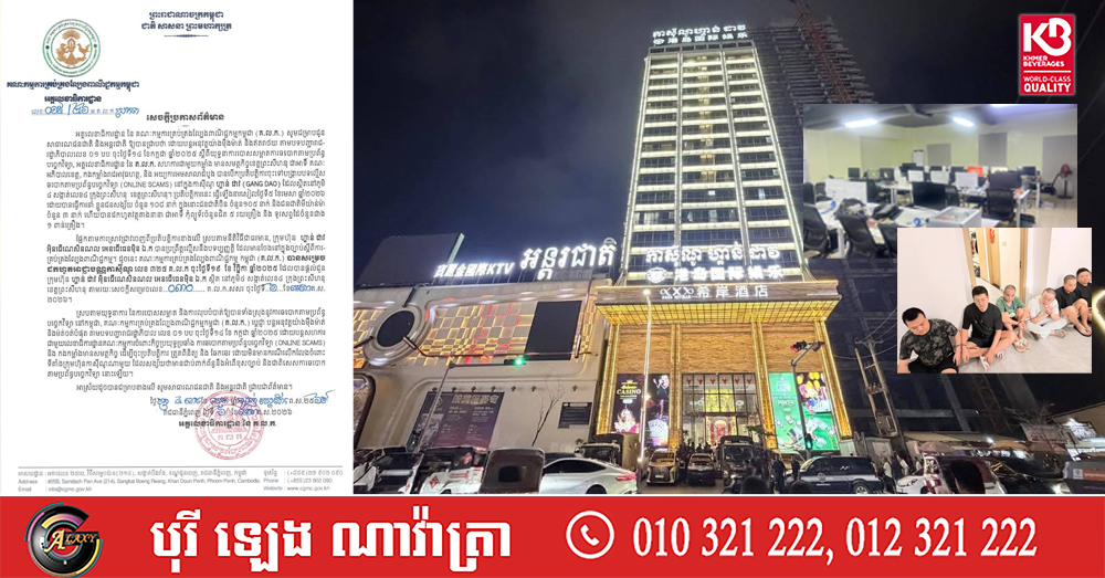 (ព្រះសីហនុ)៖ គណៈកម្មការគ្រប់គ្រងល្បែងពាណិជ្ជកម្មកម្ពុជា (គ.ល.ក.) សូមជម្រាបជូនសាធារណជនជាតិ និងអន្តរជាតិ ឱ្យបានជ្រាបថាដោយបន្តអនុវត្តយ៉ាងម៉ឺងម៉ាត់ និងឥតរាថយ តាមបទបញ្ជារាជរដ្ឋាភិបាលលេខ០១ បប ចុះថ្ងៃទី១៤ ខែកក្កដា ឆ្នាំ២០២៥ ស្តីពីយុទ្ធនាការបោសសម្អាតការឆបោកតាមប្រព័ន្ធបច្ចេកវិទ្យា, អគ្គលេខាធិការដ្ឋាន នៃ គ.ល.ក. សហការជាមួយកម្លាំងមានសមត្ថកិច្ចខេត្តព្រះសីហនុ ជាអាទិ៍គណៈអភិបាលខេត្ត, កងកម្លាំងរាជអាវុធហត្ថ និងអយ្យការអមសាលាដំបូង បានបើកប្រតិបត្តិការចុះទៅបង្ក្រាបបទល្មើសឆបោកតាមប្រព័ន្ធបច្ចេកវិទ្យា (ONLINE SCAMS) នៅក្នុងកាស៊ីណូ ហ្គាន់ ដាវ (GANG DAO) ដែលស្ថិតនៅភូមិ៤ សង្កាត់លេខ៤ ក្រុងព្រះសីហនុ ខេត្តព្រះសីហនុ។