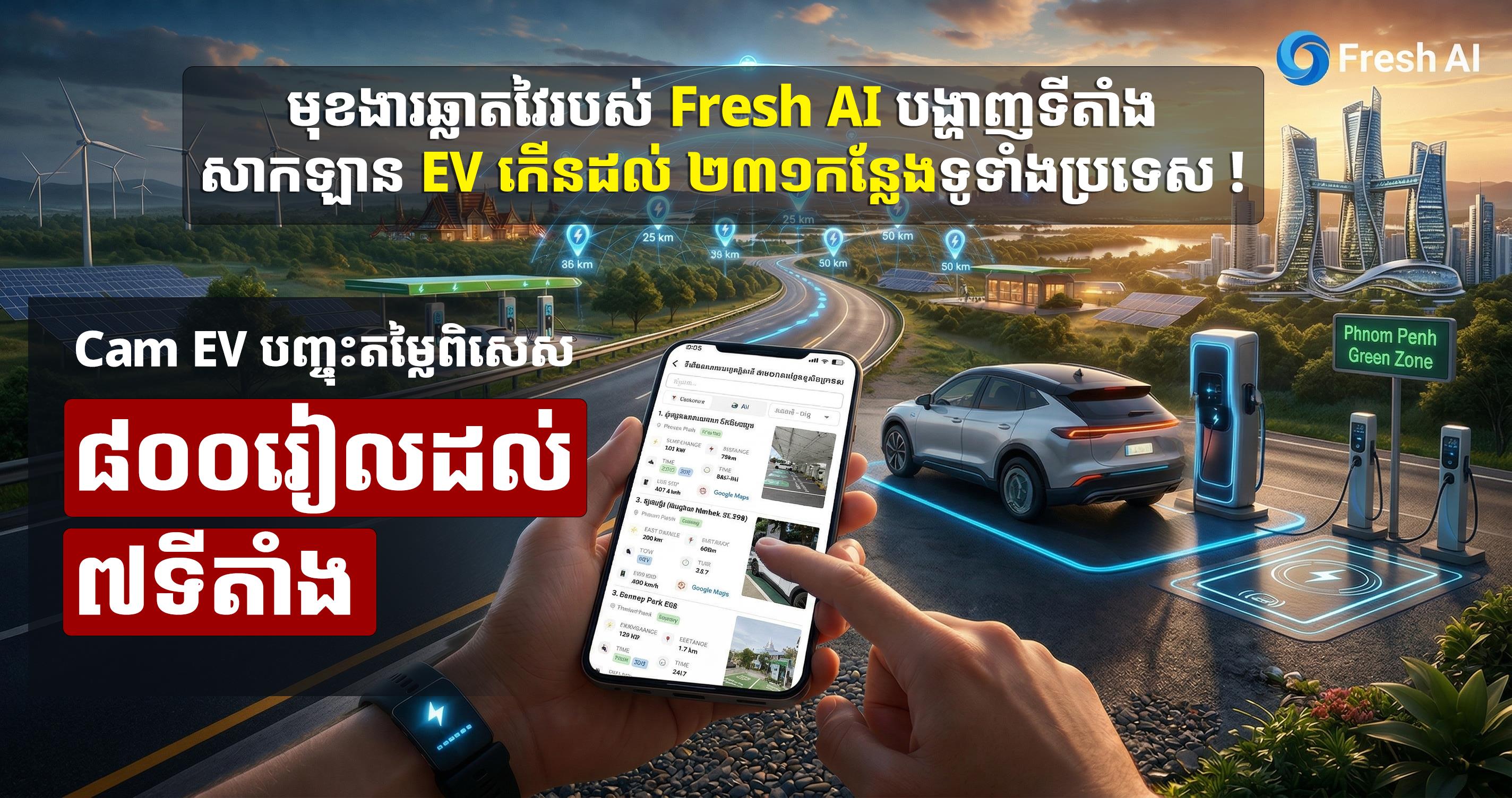 មុខងារឆ្លាតវៃរបស់ Fresh AI បង្ហាញទីតាំងសាកឡាន EV កើនដល់ ២៣១កន្លែងទូទាំងប្រទេស ខណៈ Cam EV ក៏បញ្ចុះតម្លៃពិសេស៨០០រៀលដល់៧ទីតាំង