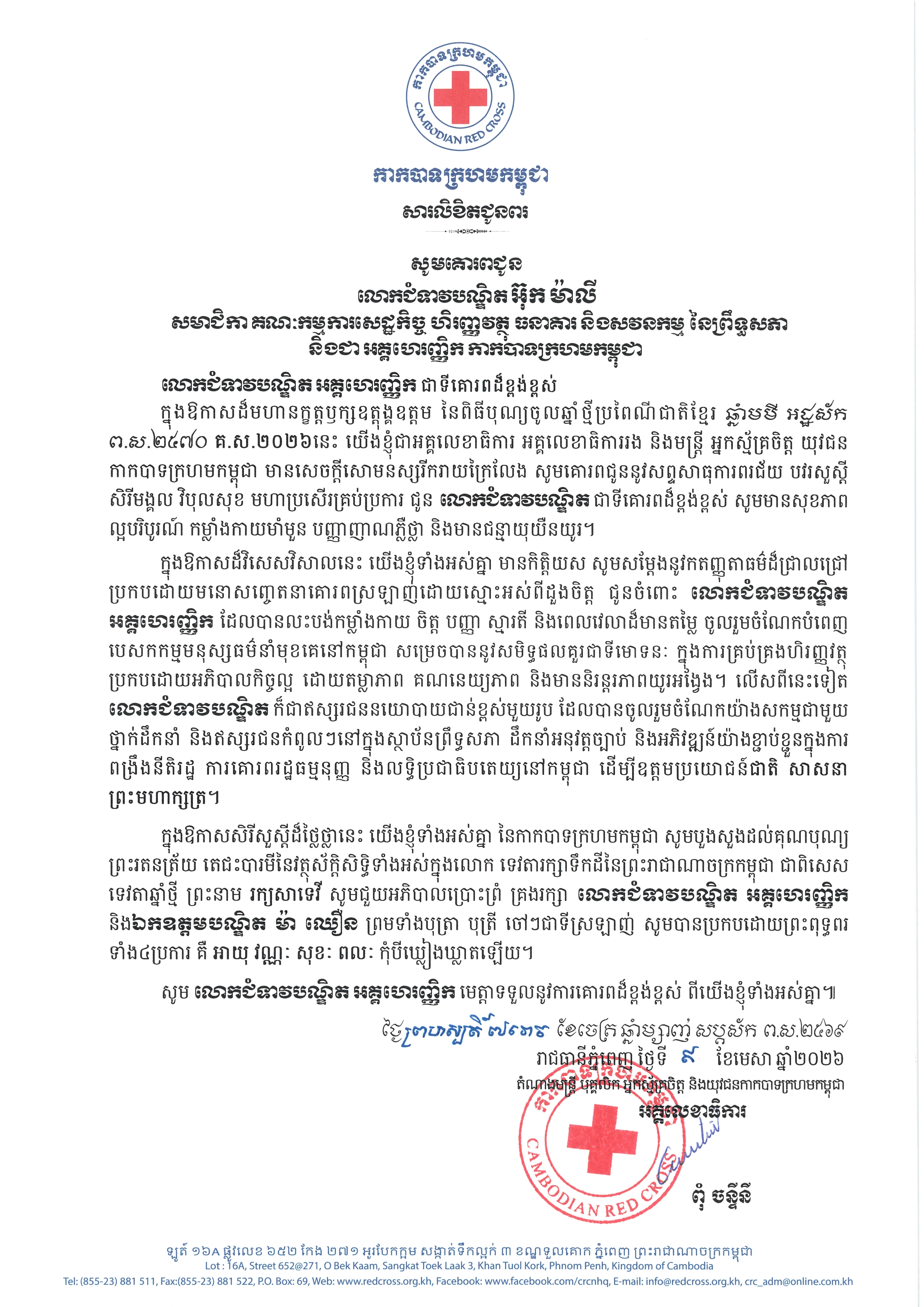 សមាជិក សមាជិកា គណៈកម្មាធិការកណ្តាល ព្រមទាំងមន្ត្រី បុគ្គលិក អ្នកស្ម័គ្រចិត្ត និងយុវជននៃកាកបាទក្រហមកម្ពុជា ផ្ញើសារលិខិតជូនពរលោកជំទាវបណ្ឌិត អ៊ុក ម៉ាលី ក្នុងឱកាសបុណ្យចូលឆ្នាំថ្មី ឆ្នាំមមី