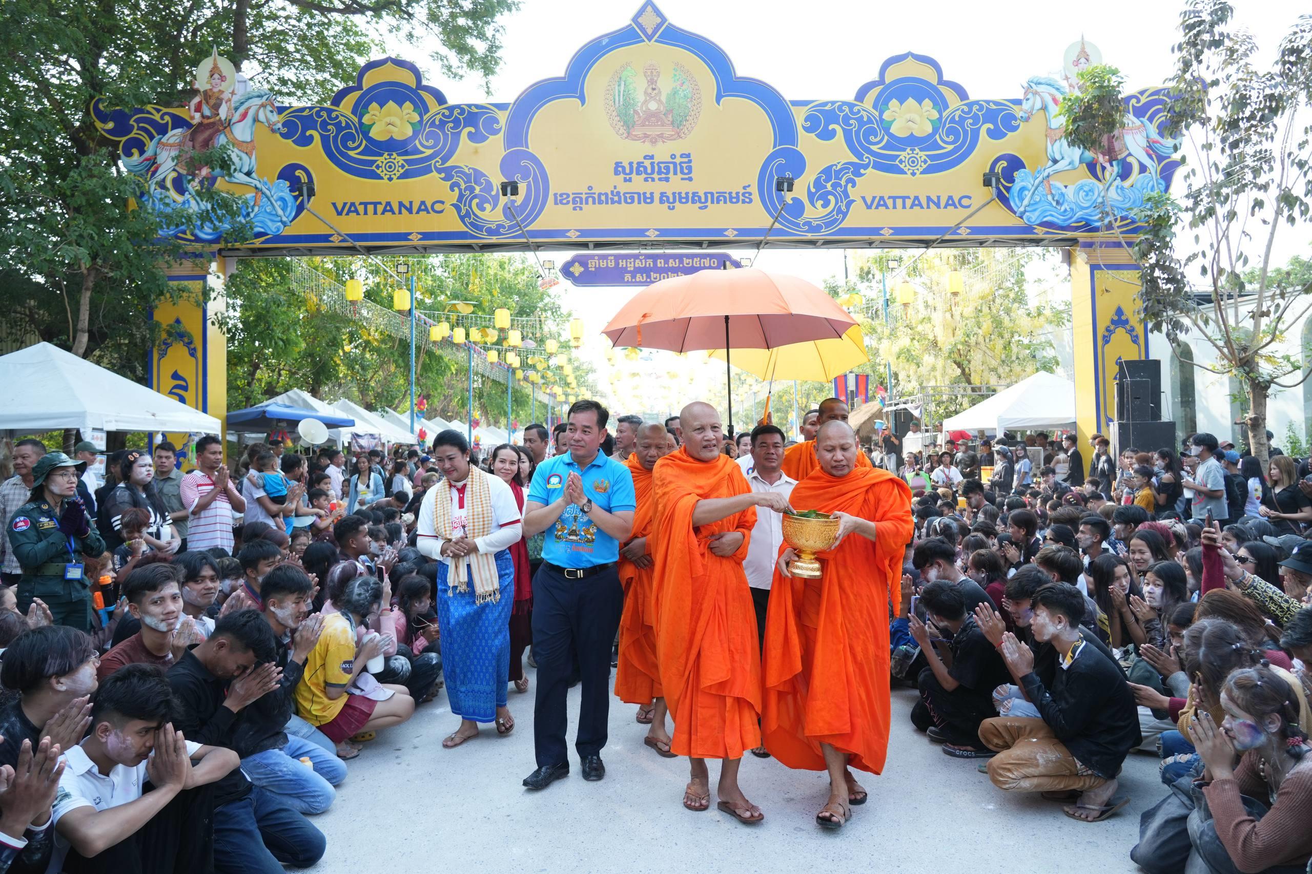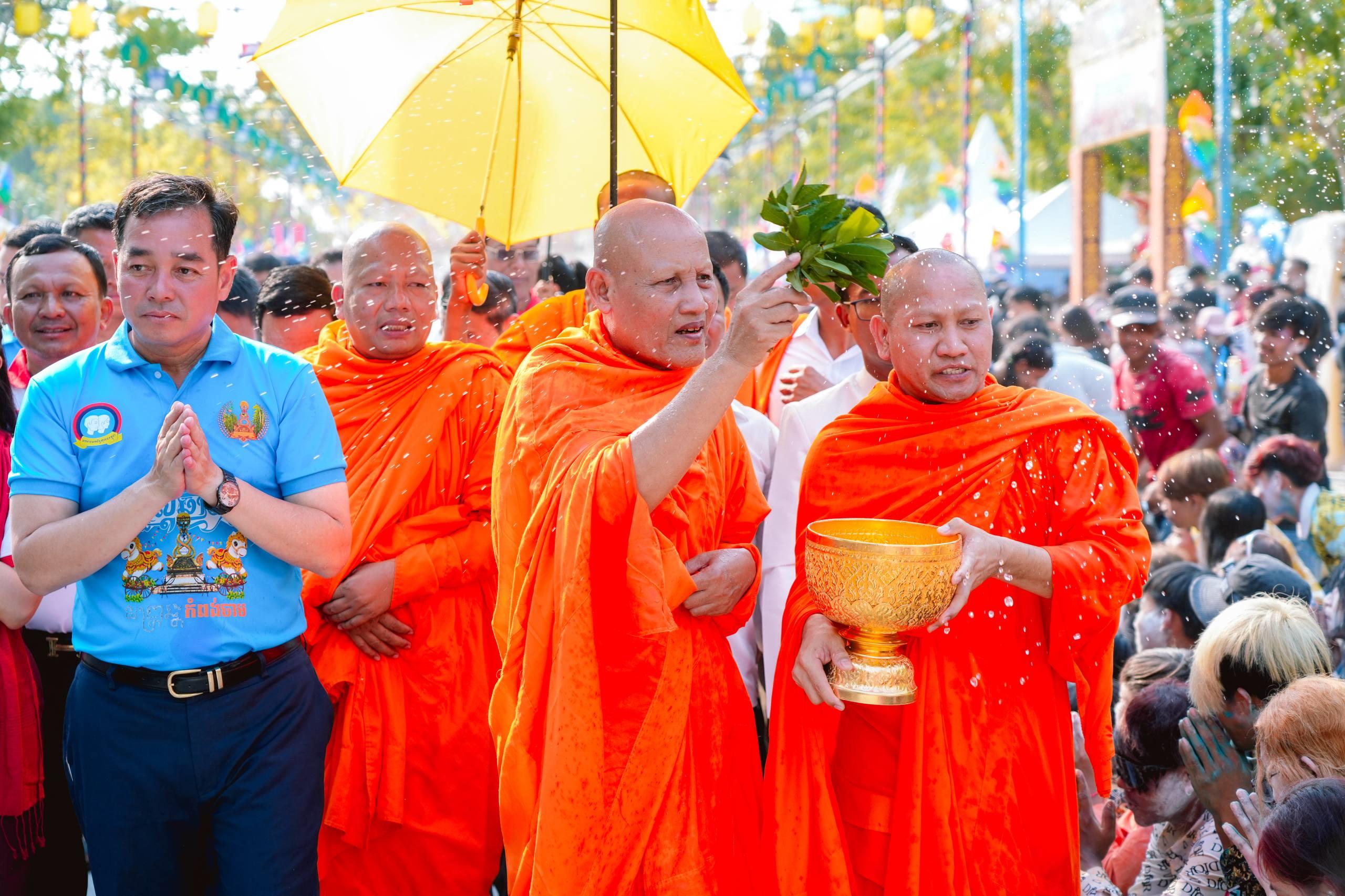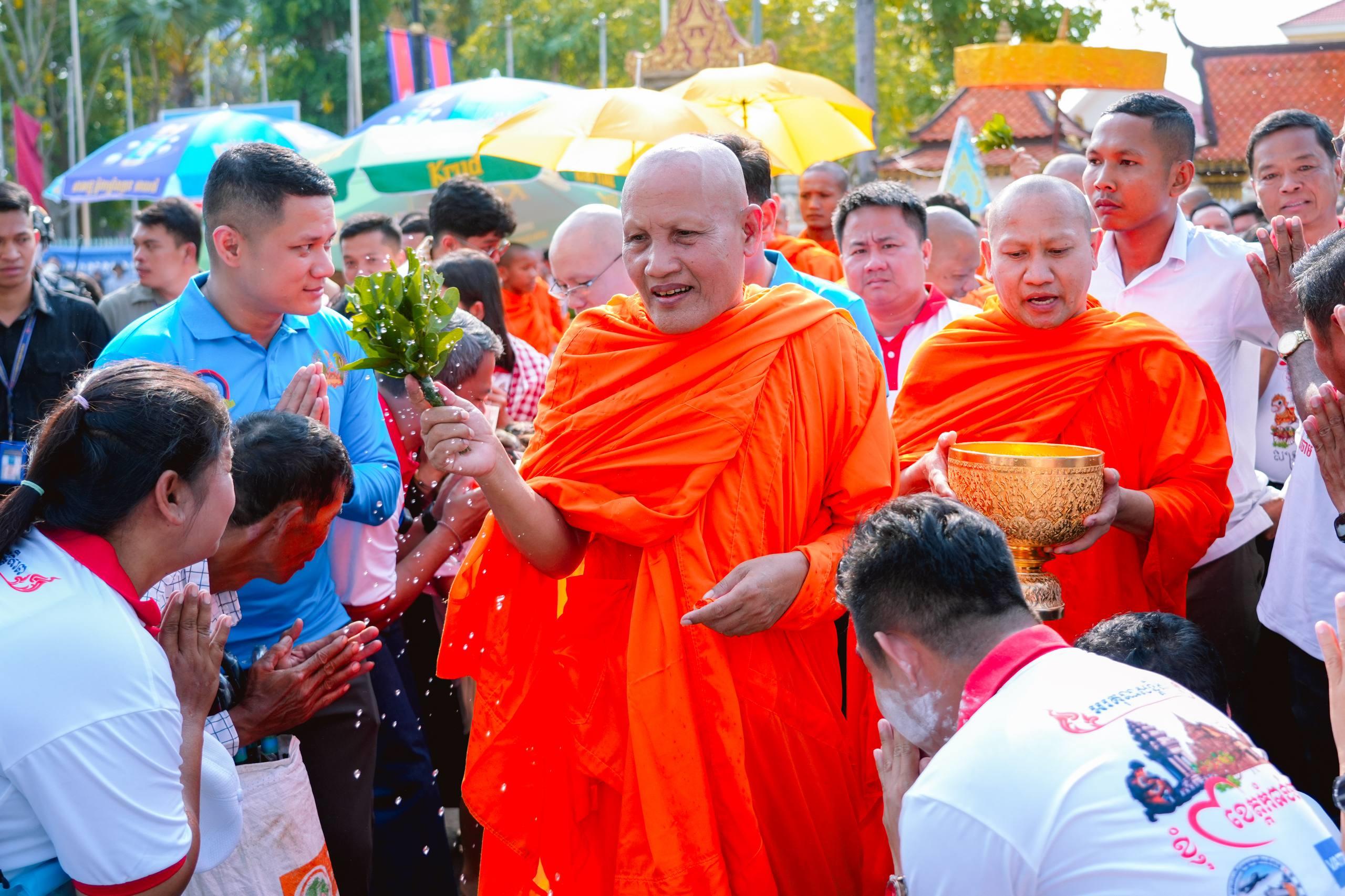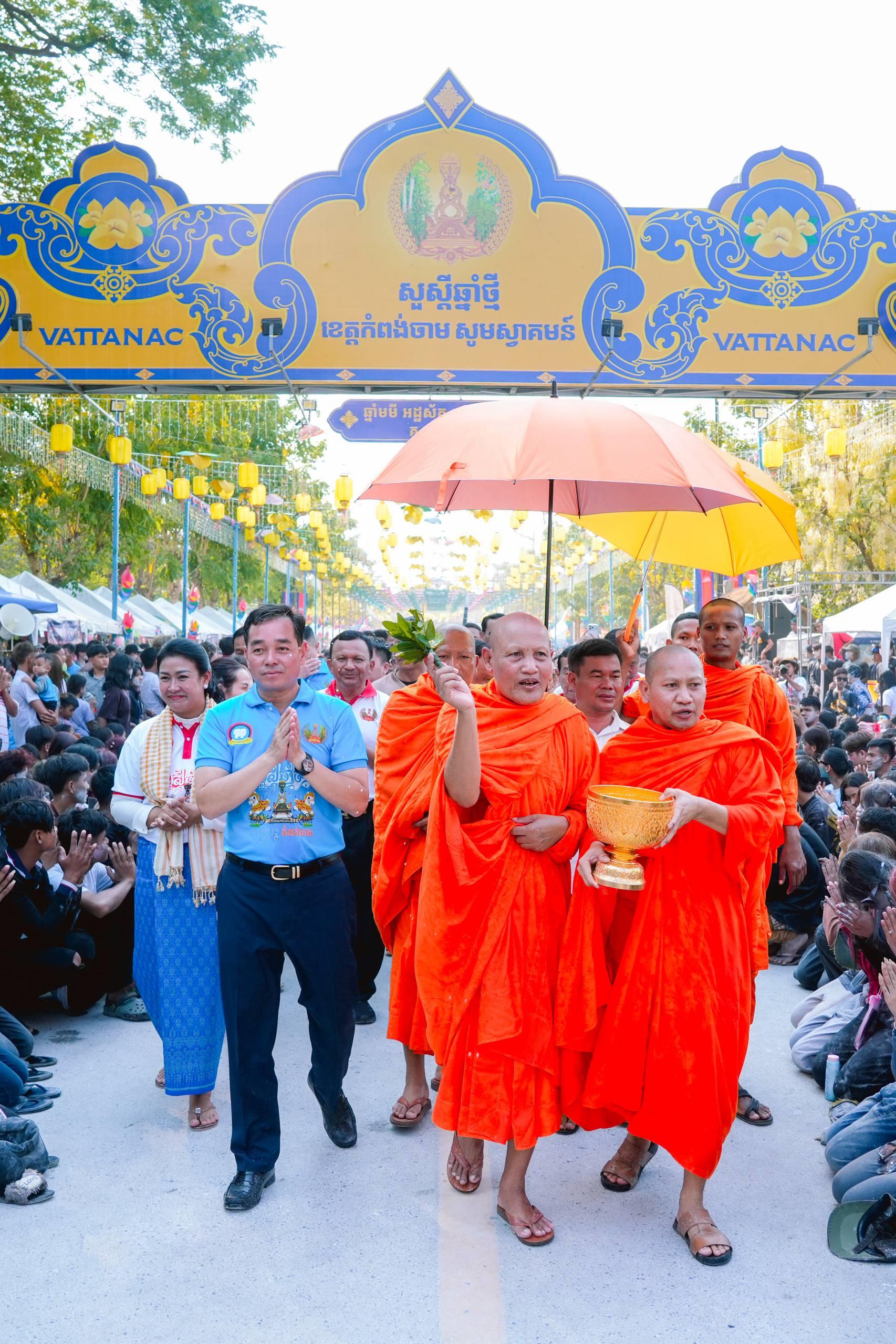 (កំពង់ចាម)៖ សម្តេចព្រះពោធិវ័ង្សកិត្តិបណ្ឌិត ណយ ច្រឹក រួមជាមួយរដ្ឋបាលខេត្តកំពង់ចាម បានយាងដឹកនាំព្រះសង្ឃ ១០៨ អង្គ ប្រោះព្រំព្រះពុទ្ធមន្តចម្រើនសិរី និងព្រះរាជទានយ័ន្ត ចំនួន ១០,០០០សន្លឹក ជូនដល់ប្រជាពលរដ្ឋ មកលេងកម្សាននាខេត្តកំពង់ចាមដែលមកចូលរួម ដើម្បីពង្រឹងសេចក្ដីសុខផ្នែកផ្លូវចិត្ត នារសៀលថ្ងៃទីបីនៃពិធីបុណ្យចូលឆ្នាំខ្មែរ គឺជាថ្ងៃឡើងស័ក ឬថ្ងៃឆ្លង ដែលគេប្រារព្ធពិធីស្រង់ទឹករូបបដិមាព្រះពុទ្ធ ប្រោះព្រុំសុំសេចក្តីសុខ ជូនវីរះកងទ័ពនិង ធ្វើបុណ្យឧទ្ទិសកុសលដល់យុទ្ធជនពលី នារដ្ឋបាលខេត្តកំពង់ចាម។