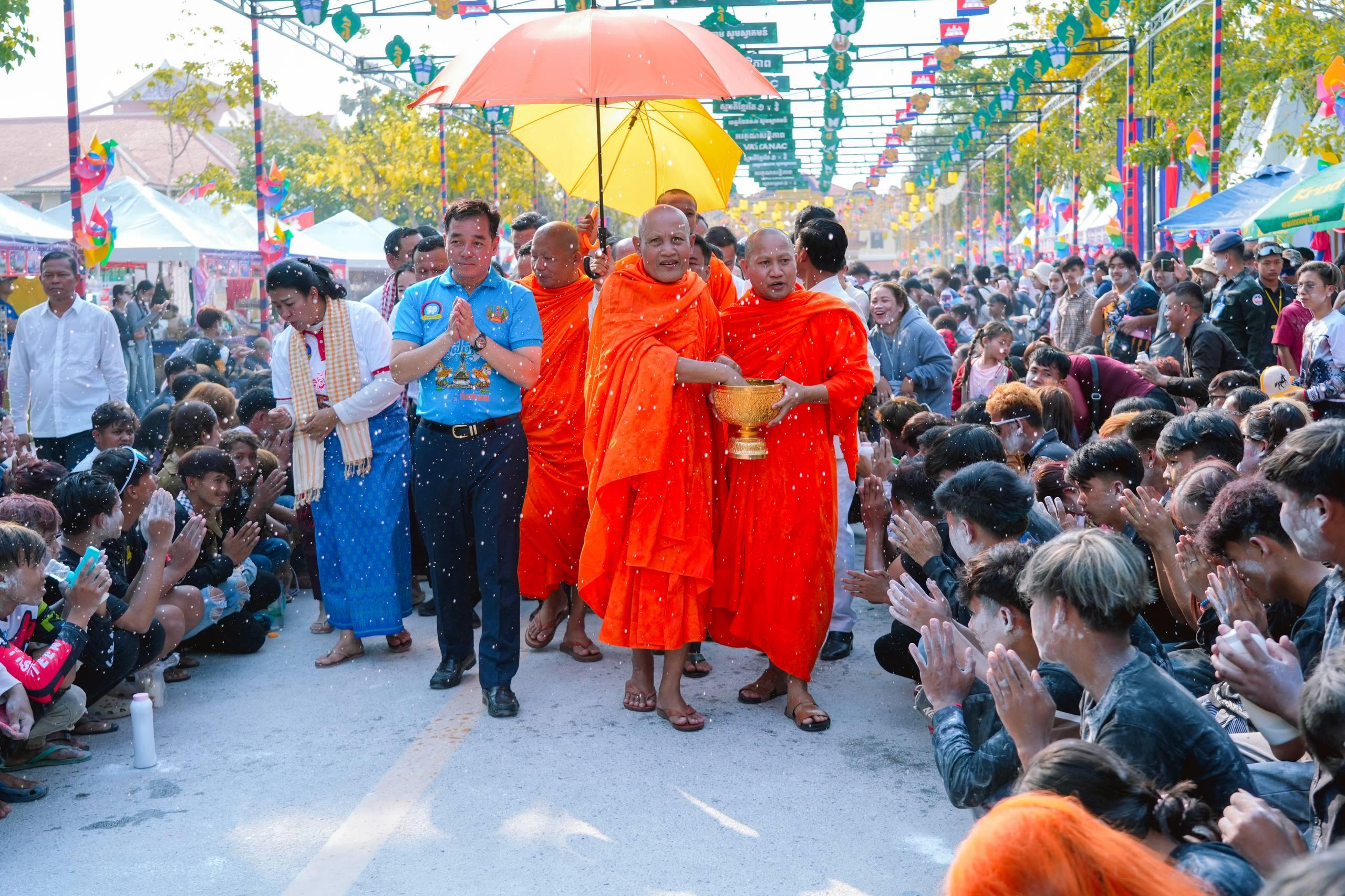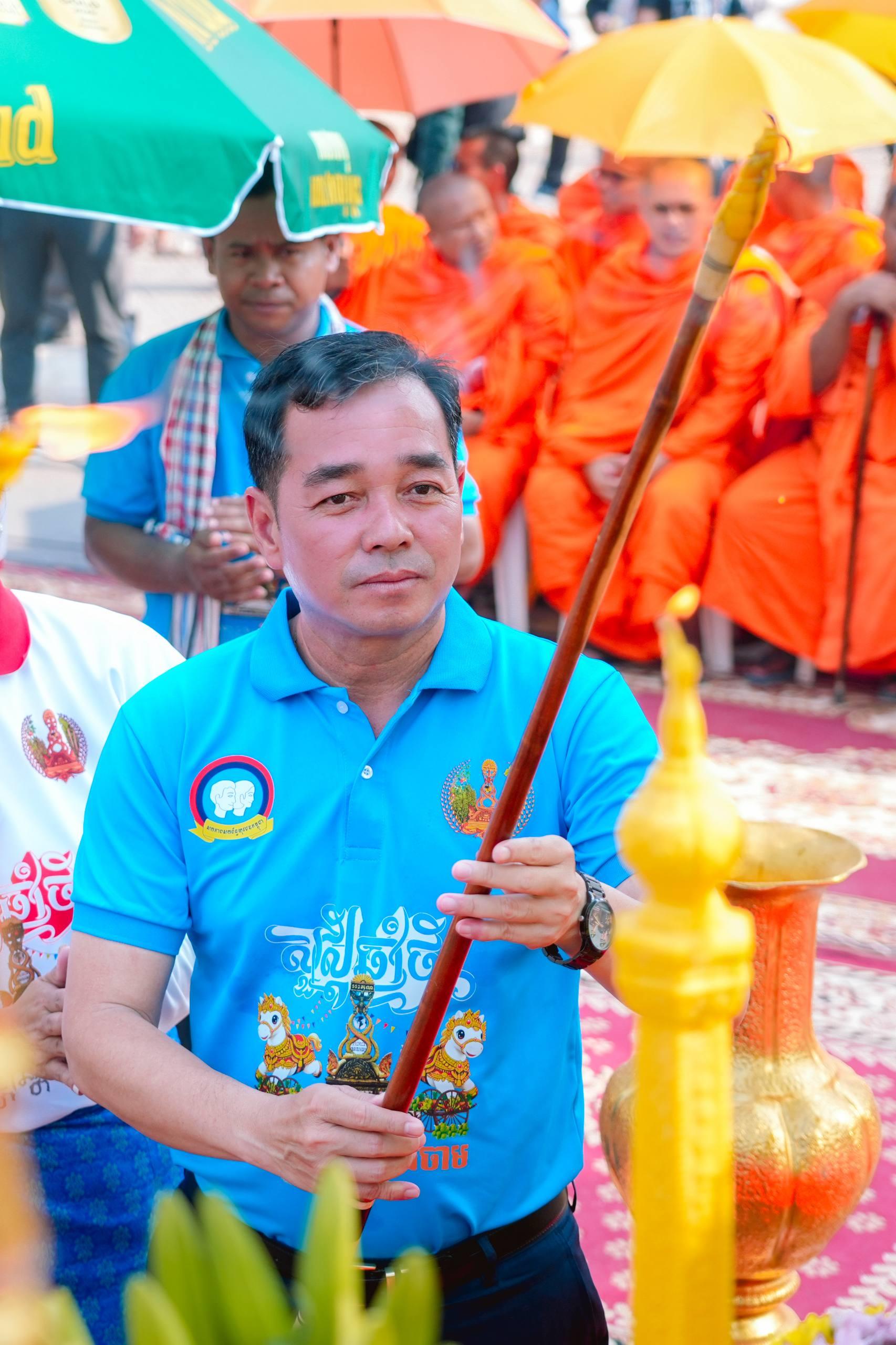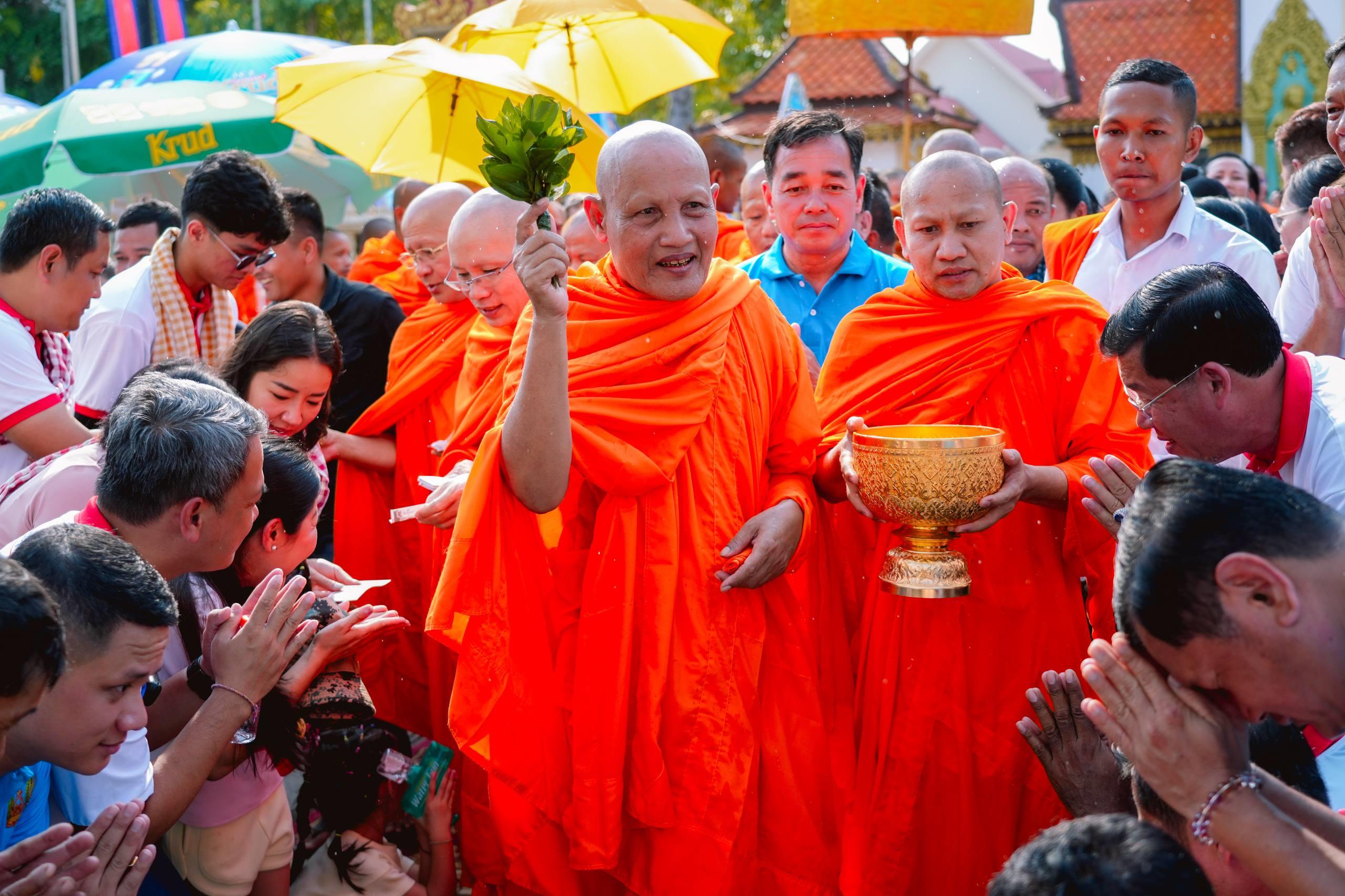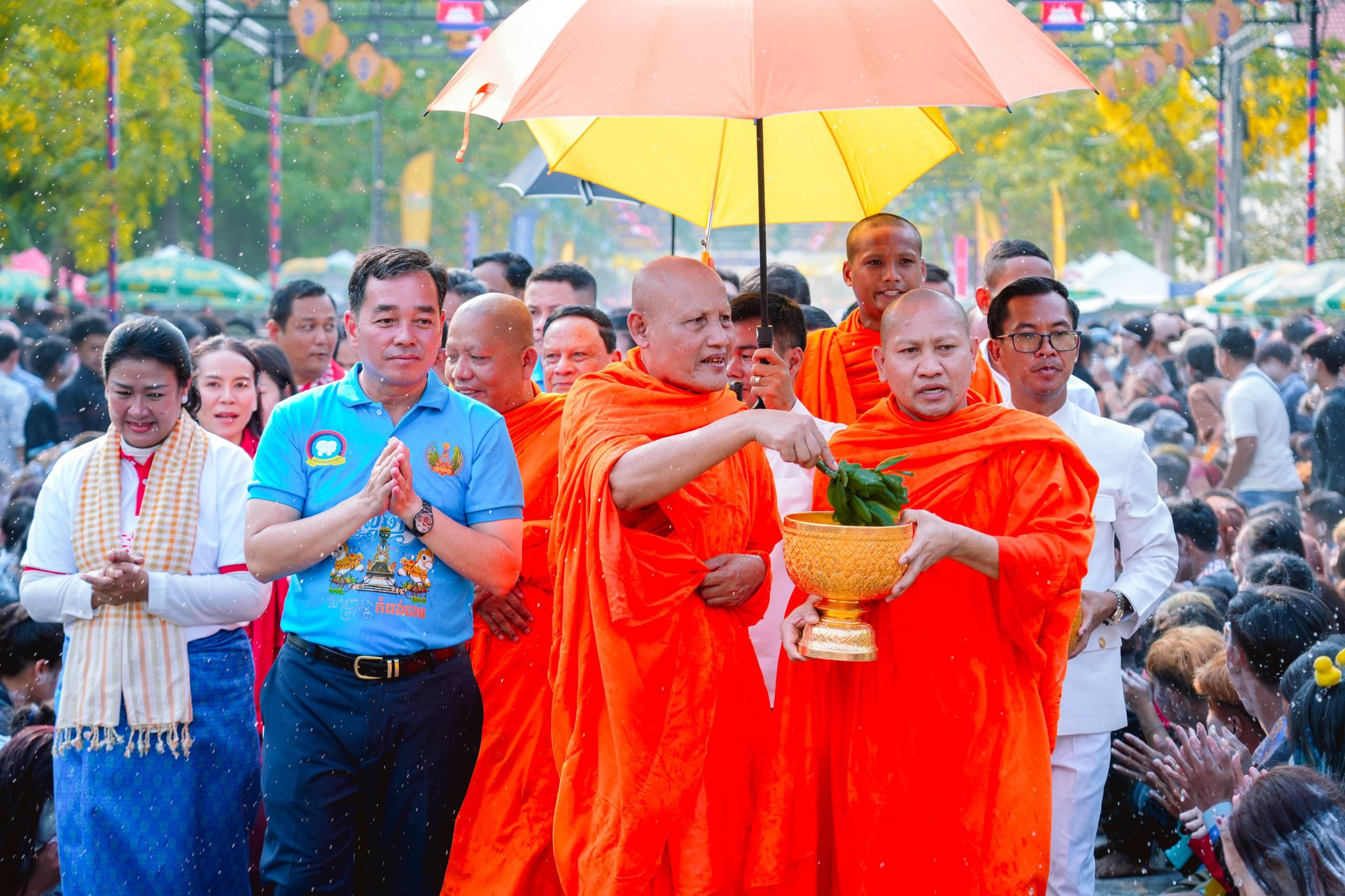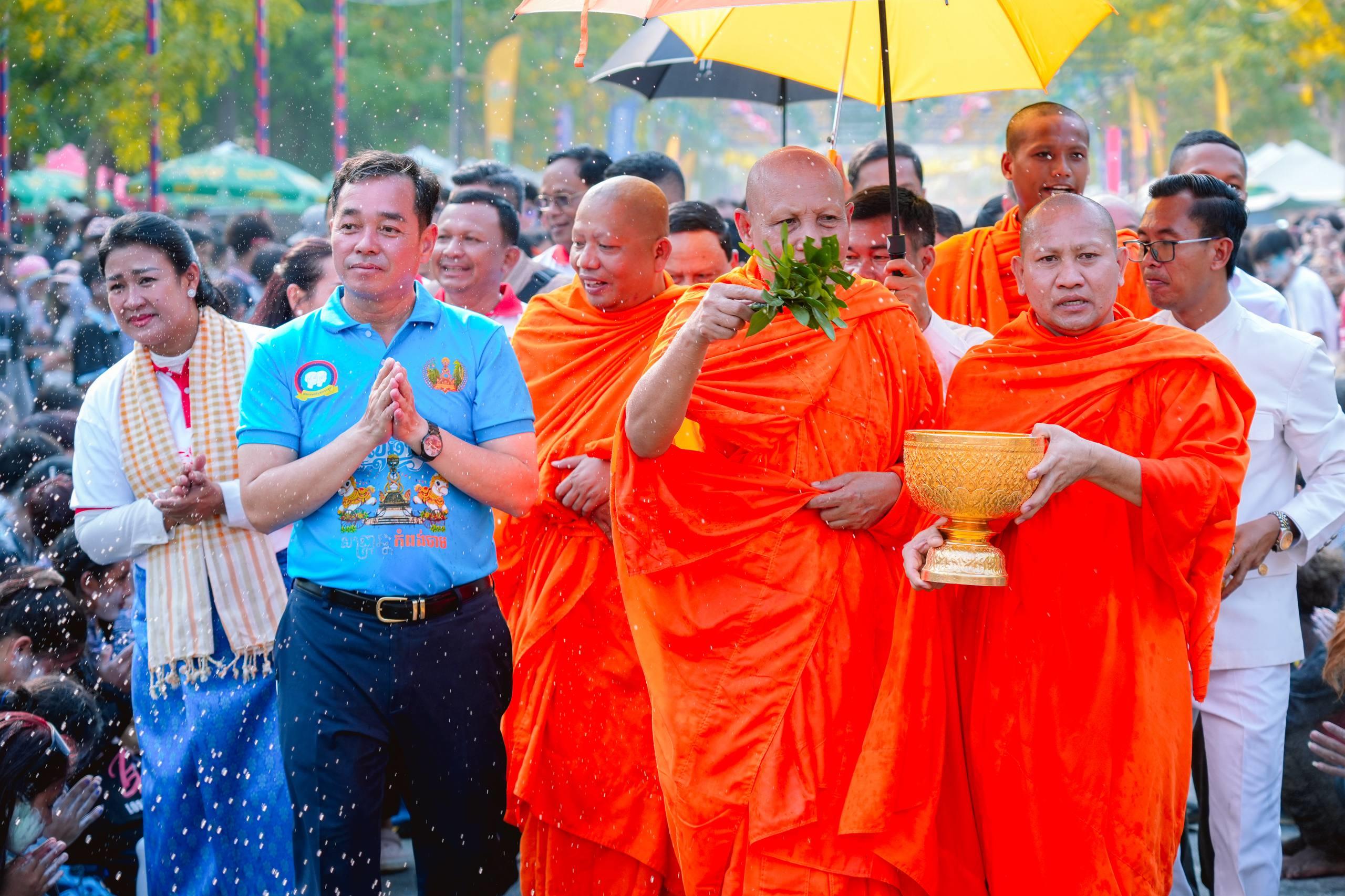 (កំពង់ចាម)៖ សម្តេចព្រះពោធិវ័ង្សកិត្តិបណ្ឌិត ណយ ច្រឹក រួមជាមួយរដ្ឋបាលខេត្តកំពង់ចាម បានយាងដឹកនាំព្រះសង្ឃ ១០៨ អង្គ ប្រោះព្រំព្រះពុទ្ធមន្តចម្រើនសិរី និងព្រះរាជទានយ័ន្ត ចំនួន ១០,០០០សន្លឹក ជូនដល់ប្រជាពលរដ្ឋ មកលេងកម្សាននាខេត្តកំពង់ចាមដែលមកចូលរួម ដើម្បីពង្រឹងសេចក្ដីសុខផ្នែកផ្លូវចិត្ត នារសៀលថ្ងៃទីបីនៃពិធីបុណ្យចូលឆ្នាំខ្មែរ គឺជាថ្ងៃឡើងស័ក ឬថ្ងៃឆ្លង ដែលគេប្រារព្ធពិធីស្រង់ទឹករូបបដិមាព្រះពុទ្ធ ប្រោះព្រុំសុំសេចក្តីសុខ ជូនវីរះកងទ័ពនិង ធ្វើបុណ្យឧទ្ទិសកុសលដល់យុទ្ធជនពលី នារដ្ឋបាលខេត្តកំពង់ចាម។