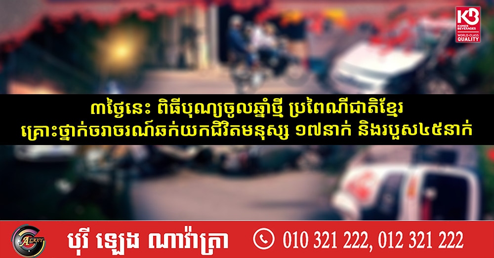 ៣ថ្ងៃនេះ ពិធីបុណ្យចូលឆ្នាំថ្មី ប្រពៃណីជាតិខ្មែរ គ្រោះថ្នាក់ចរាចរណ៍ឆក់យកជិវិតមនុស្ស ១៧នាក់ និងរបួស៤៥នាក់