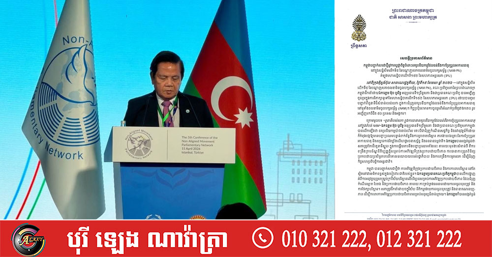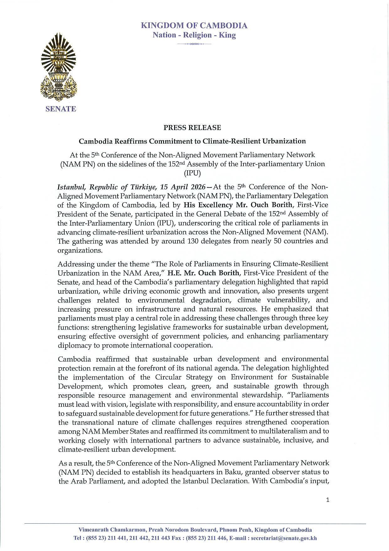 (តួគីយេ)៖ នៅក្នុងសន្និសីទលើកទី៥ នៃបណ្តាញសភាចលនាមិនចូលបក្សសម្ព័ន្ធ (NAM PN), គណៈប្រតិភូសភានៃកម្ពុជា ដឹកនាំដោយលោក អ៊ុច បូររិទ្ធ អនុប្រធានទី១ព្រឹទ្ធសភា និងជាប្រធានគណៈប្រតិភូ នៅថ្ងៃទី១៥ ខែមេសា ឆ្នាំ២០២៦ បានអញ្ជើញចូលរួមក្នុងការពិភាក្សាទូទៅនៃមហាសន្និបាតលើកទី១៥២ នៃសហភាពអន្តរសភា (IPU) ដោយបានគូសបញ្ជាក់ពី តួនាទីដ៏សំខាន់របស់សភា ក្នុងការជំរុញនគរូបនីយកម្មដែលធន់នឹងបម្រែបម្រួលអាកាសធាតុ នៅទូទាំងចលនាមិនចូលបក្សសម្ព័ន្ធ (NAM)។ កិច្ចប្រជុំនេះមានការចូលរួមពីសំណាក់ប្រតិភូជាង១៣០ រូប អញ្ជើញមកពីជិត ៥០ ប្រទេស និងអង្គការ។