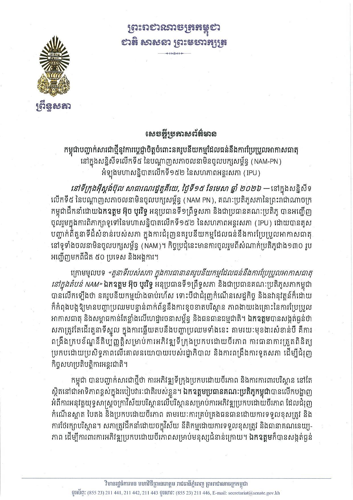 កម្ពុជាបញ្ជាក់សារជាថ្មីនូវការប្តេជ្ញាចិត្តចំពោះនគរូបនីយកម្ម ដែលធន់នឹងការប្រែប្រួលអាកាសធាតុ នៅក្នុងសន្និសីទលើកទី៥ នៃ NAM-PN អំឡុងមហាសន្និបាតលើកទី១៥២ នៃ IPU នៅទីក្រុងអ៊ីស្តង់ប៊ុល