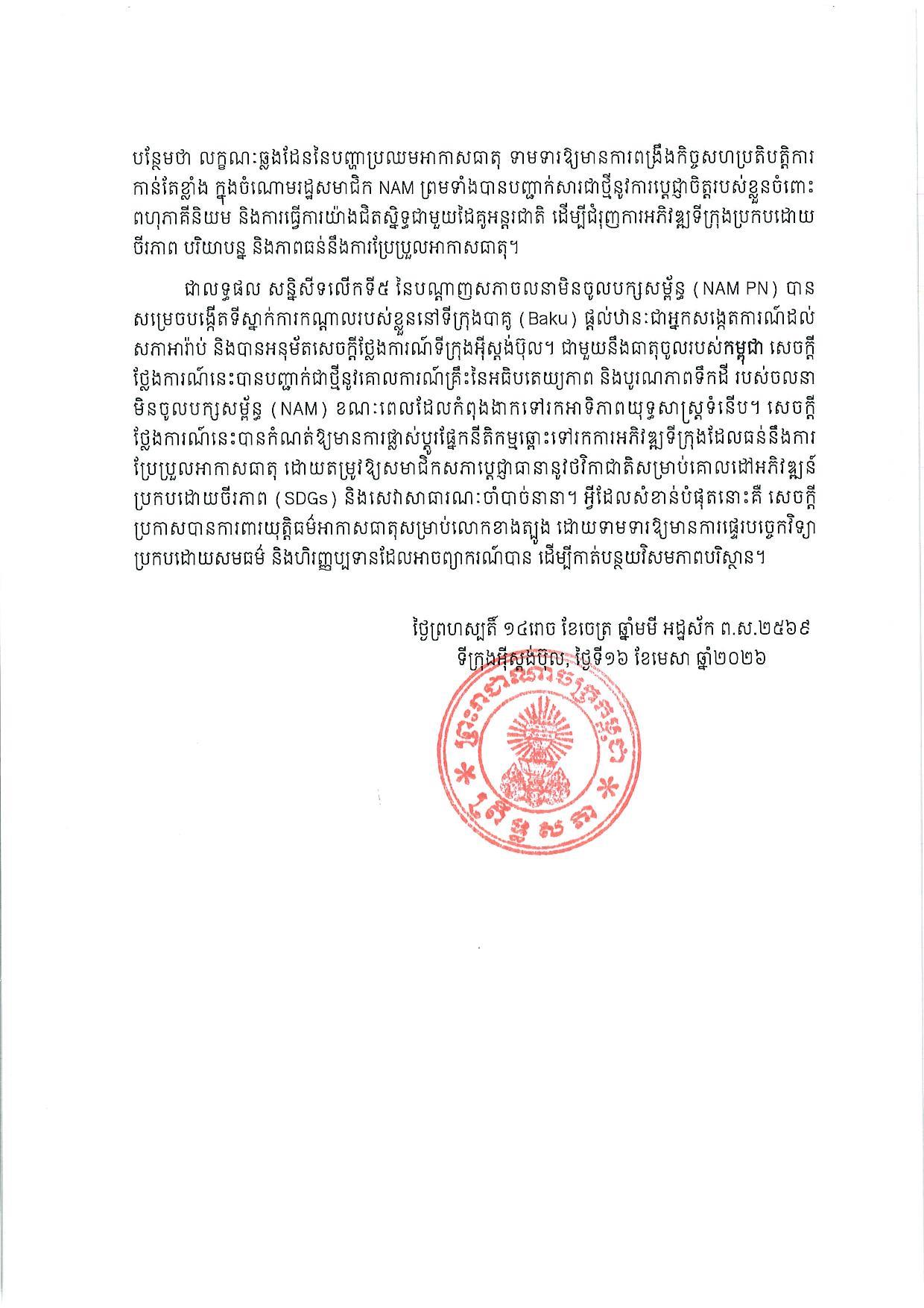 ជាលទ្ធផល សន្និសីទលើកទី៥ នៃបណ្តាញសភាចលនាមិនចូលបក្សសម្ព័ន្ធ (NAM PN) បានសម្រេចបង្កើតទីស្នាក់ការកណ្តាលរបស់ខ្លួន នៅទីក្រុងបាគូ (Baku) ផ្តល់ឋានៈជាអ្នកសង្កេតការណ៍ដល់សភាអារ៉ាប់ និងបានអនុម័តសេចក្តីថ្លែងការណ៍ទីក្រុងអ៊ីស្តង់ប៊ុល។ ជាមួយនឹងធាតុចូលរបស់កម្ពុជា សេចក្តីថ្លែងការណ៍នេះបានបញ្ជាក់ជាថ្មីនូវគោលការណ៍គ្រឹះនៃអធិបតេយ្យភាព និងបូរណភាពទឹកដី របស់ចលនាមិនចូលបក្សសម្ព័ន្ធ (NAM) ខណៈពេលដែលកំពុងងាកទៅរកអាទិភាពយុទ្ធសាស្ត្រទំនើប។ សេចក្តីថ្លែងការណ៍នេះ បានកំណត់ឱ្យមានការផ្លាស់ប្តូរផ្នែកនីតិកម្មឆ្ពោះទៅរកការអភិវឌ្ឍទីក្រុងដែលធន់នឹងការប្រែប្រួលអាកាសធាតុ ដោយតម្រូវឱ្យសមាជិកសភាប្តេជ្ញាធានានូវថវិកាជាតិសម្រាប់គោលដៅអភិវឌ្ឍន៍ប្រកបដោយចីរភាព (SDGs) និងសេវាសាធារណៈចាំបាច់នានា។ អ្វីដែលសំខាន់បំផុតនោះគឺ សេចក្ដីប្រកាសបានការពារយុត្តិធម៌ អាកាសធាតុសម្រាប់តំបន់ភាគខាងត្បូងនៃពិភពលោក ដោយទាមទារឱ្យមានការផ្ទេរបច្ចេកវិទ្យាប្រកបដោយសមធម៌ និងហិរញ្ញប្បទានដែលអាចព្យាករណ៍បាន ដើម្បីកាត់បន្ថយវិសមភាពបរិស្ថាន៕