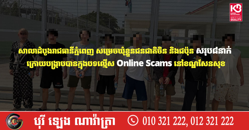 សាលាដំបូងរាជធានីភ្នំពេញ សម្រេចឃុំខ្លួនជនជាតិចិន និងជប៉ុន សរុប៨នាក់ ក្រោយបង្ក្រាបបានក្នុងបទល្មើស Online Scams នៅខណ្ឌសែនសុខ