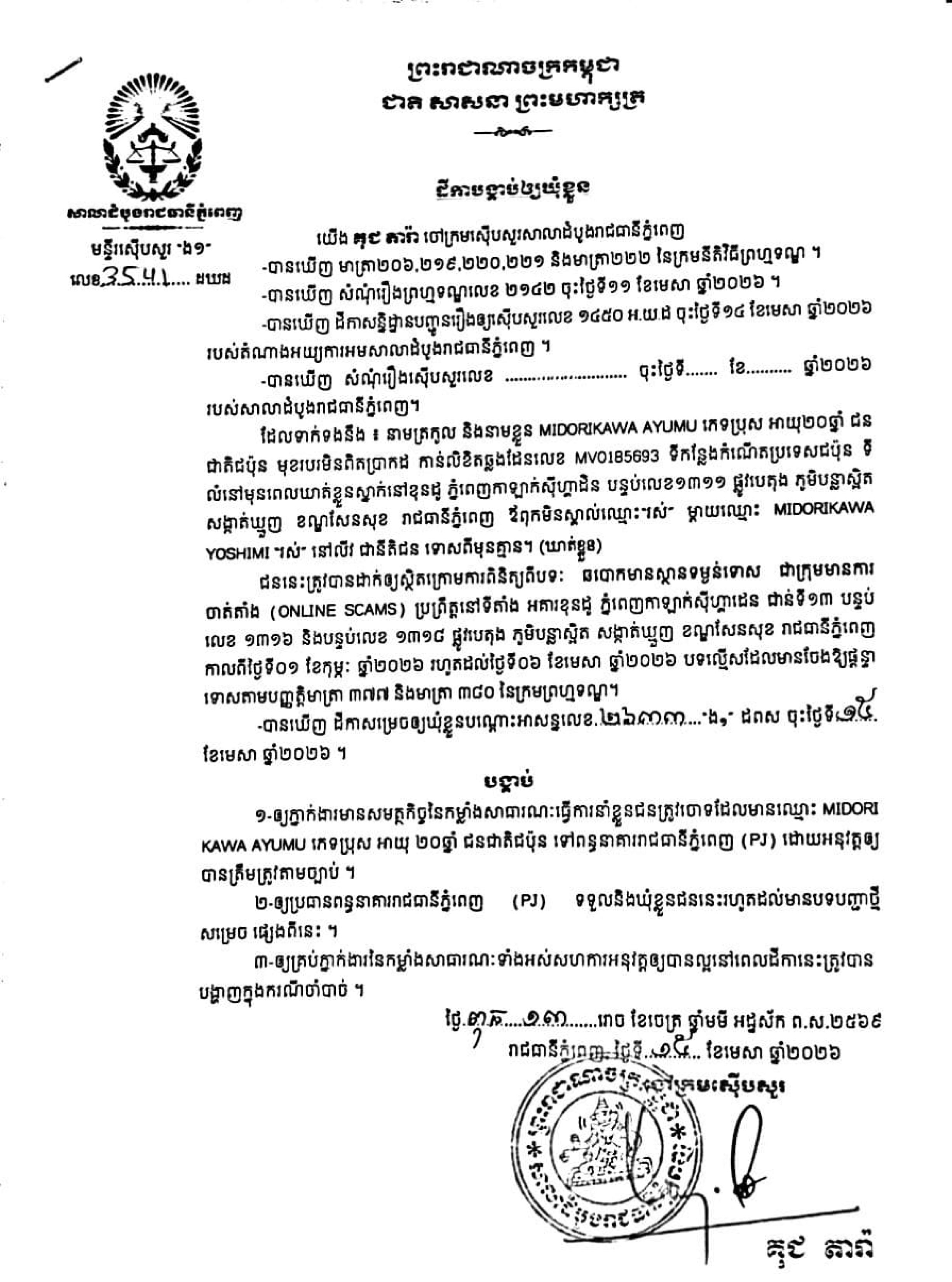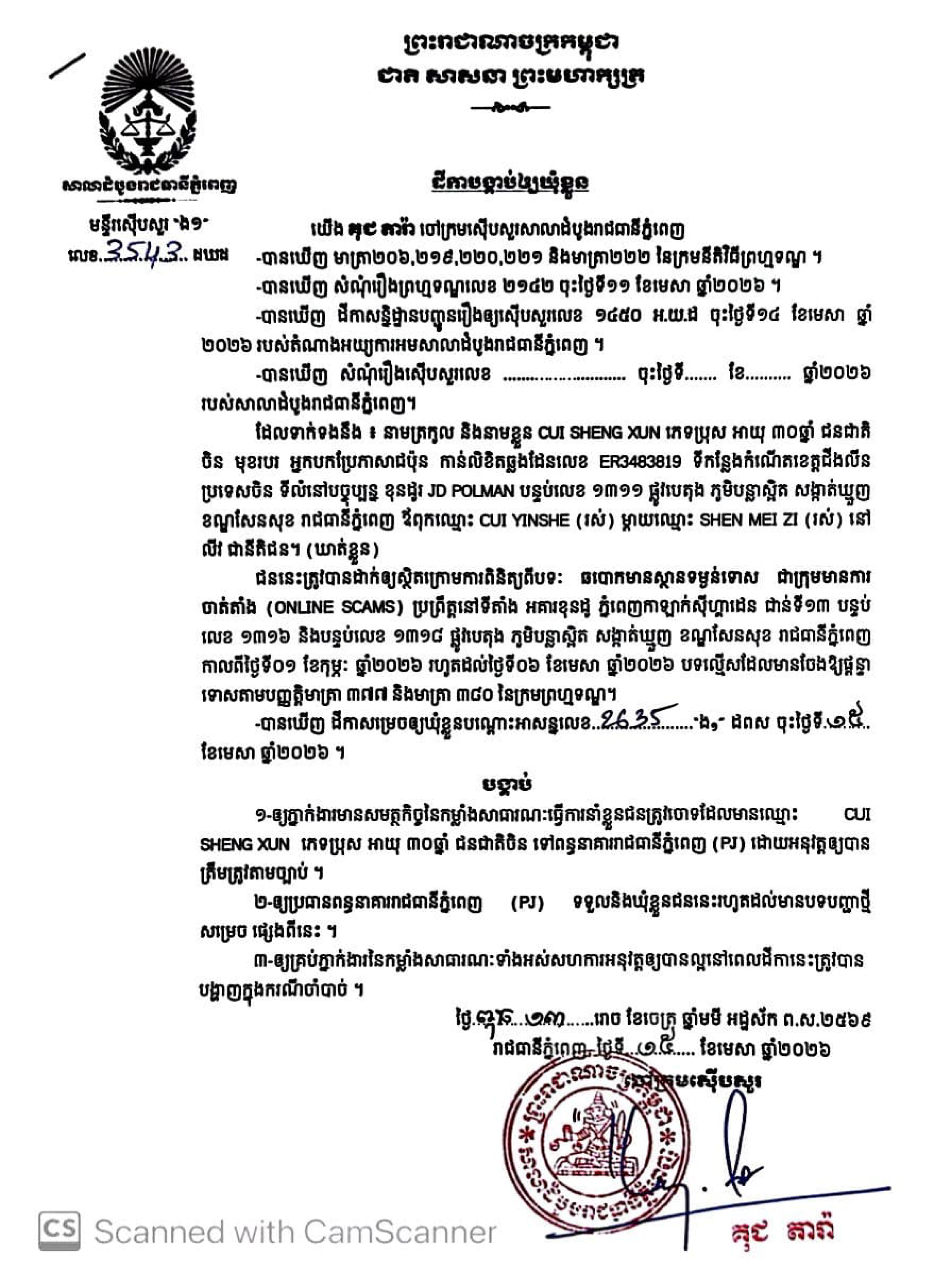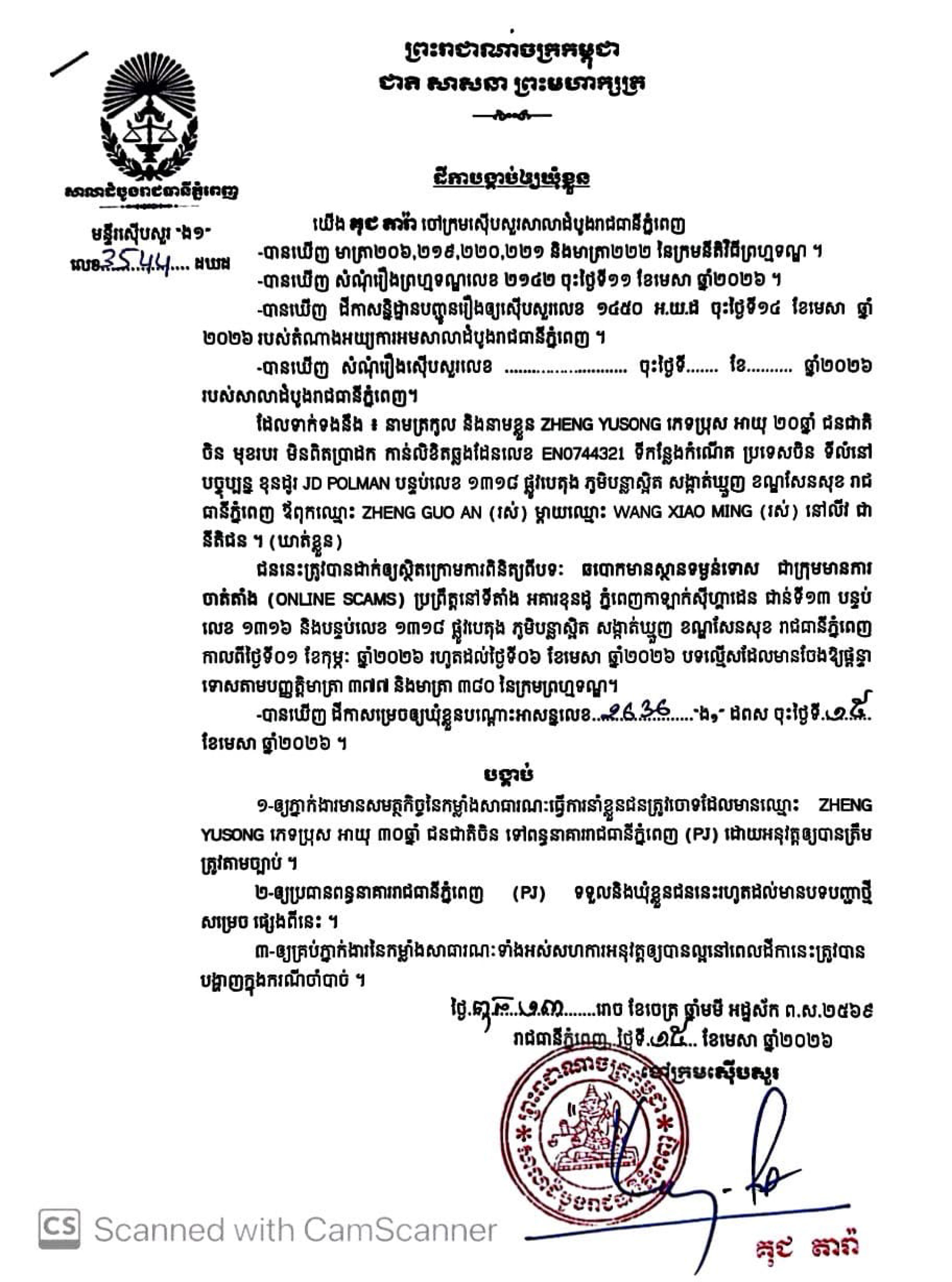 (ភ្នំពេញ)៖ ចៅក្រមស៊ើបសួរ នៃសាលាដំបូងរាជធានីភ្នំពេញ នៅថ្ងៃទី១៥ ខែមេសា ឆ្នាំ២០២៦ បានសម្រេចចោទប្រកាន់ជនត្រូវចោទជា ចំនួន៨នាក់ ពីបទឆបោកមានស្ថានទម្ងន់ទោសជាក្រុមមានការចាត់តាំង Online Scam ទៅឃុំខ្លួននៅពន្ធនាគាររាជធានីភ្នំពេញ (PJ)។