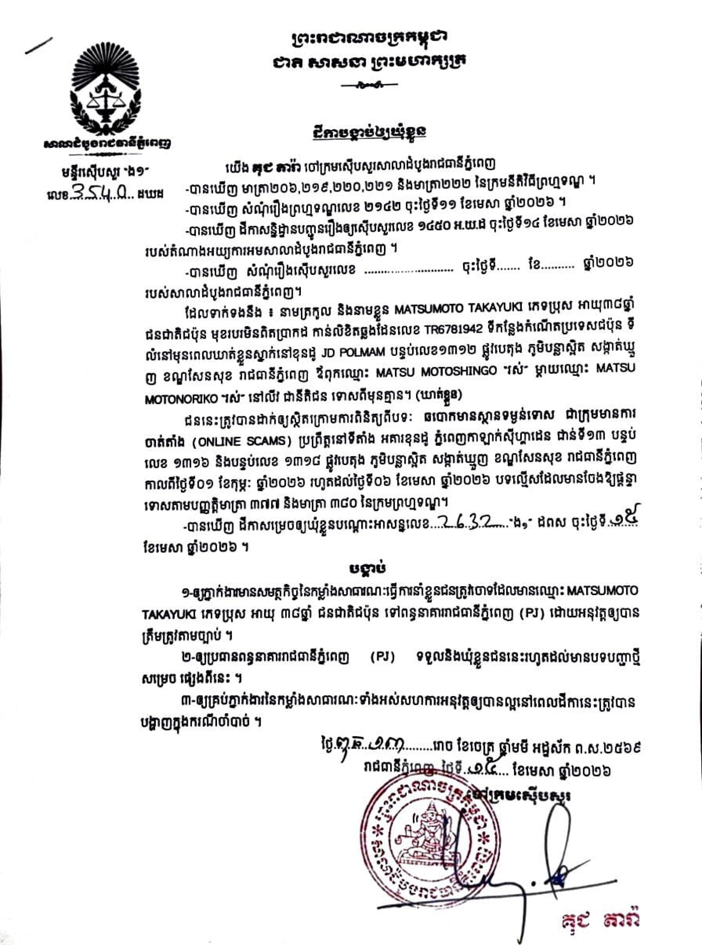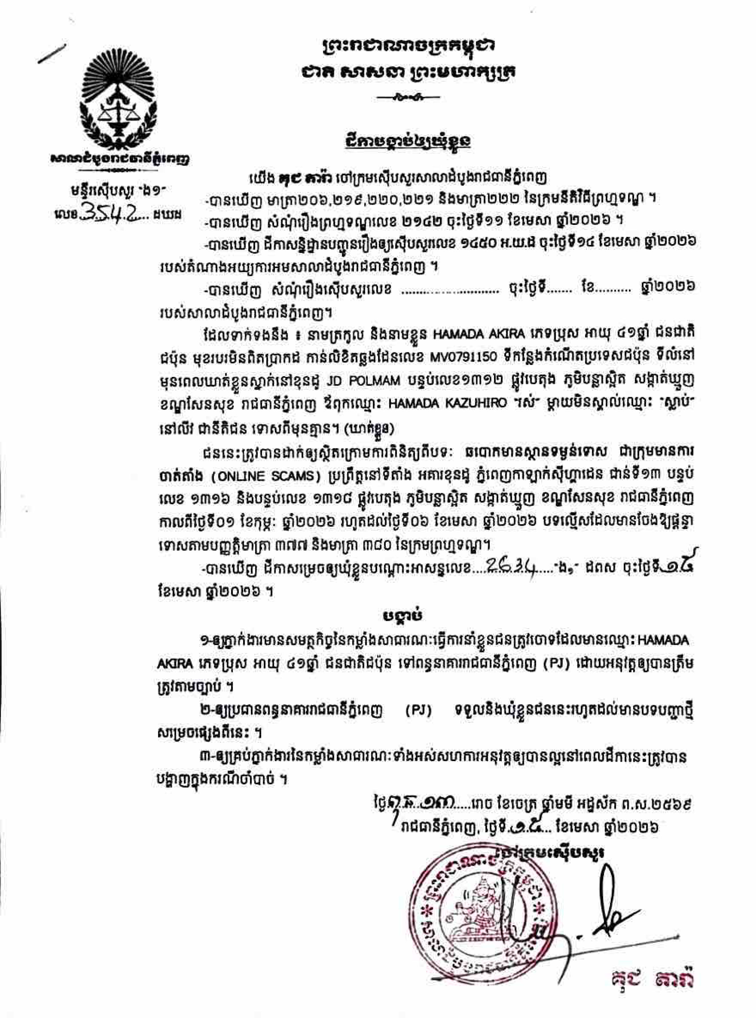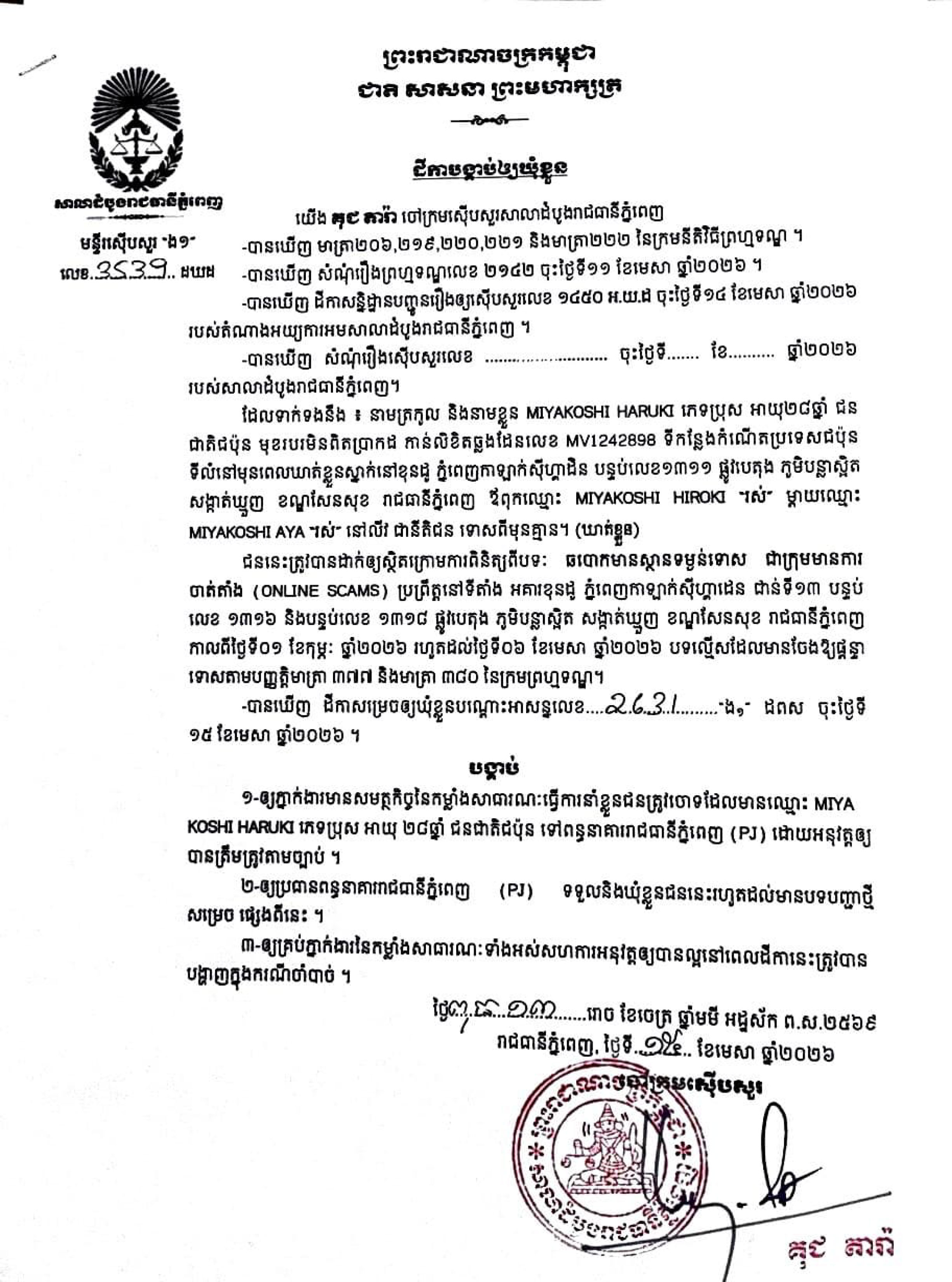 (ភ្នំពេញ)៖ ចៅក្រមស៊ើបសួរ នៃសាលាដំបូងរាជធានីភ្នំពេញ នៅថ្ងៃទី១៥ ខែមេសា ឆ្នាំ២០២៦ បានសម្រេចចោទប្រកាន់ជនត្រូវចោទជា ចំនួន៨នាក់ ពីបទឆបោកមានស្ថានទម្ងន់ទោសជាក្រុមមានការចាត់តាំង Online Scam ទៅឃុំខ្លួននៅពន្ធនាគាររាជធានីភ្នំពេញ (PJ)។