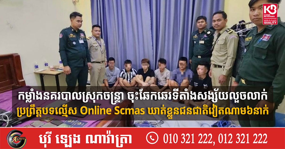 កម្លាំងនគរបាលស្រុកចន្ទ្រា ចុះឆែកឆេរទីតាំងសង្ស័យលួចលាក់ប្រព្រឹត្តបទល្មើស Online Scmas ឃាត់ខ្លួនជនជាតិវៀតណាម៦នាក់