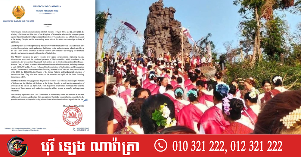 (ភ្នំពេញ)៖ នៅថ្ងៃទី២២ ខែមេសា ឆ្នាំ២០២៦នេះ ក្រសួងវប្បធម៌ និងវិចិត្រសិល្បៈបានចេញសេចក្តីថ្លែងការណ៍ ដោយបានបន្តធ្វើការតវ៉ាយ៉ាងខ្លាំងក្លាបំផុត ចំពោះវត្តមាន និងការបន្តបង្កសកម្មភាពខុសច្បាប់របស់អាជ្ញាធរថៃ នៅប្រាសាទតាក្របី និងតំបន់ជុំវិញ ដែលជាទីតាំងស្ថិតនៅក្នុងដែនអធិបតេយ្យភាពរបស់កម្ពុជា។