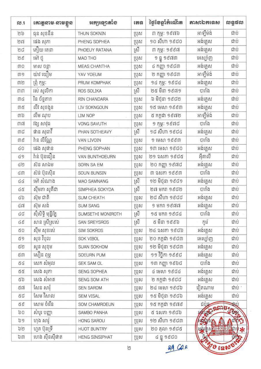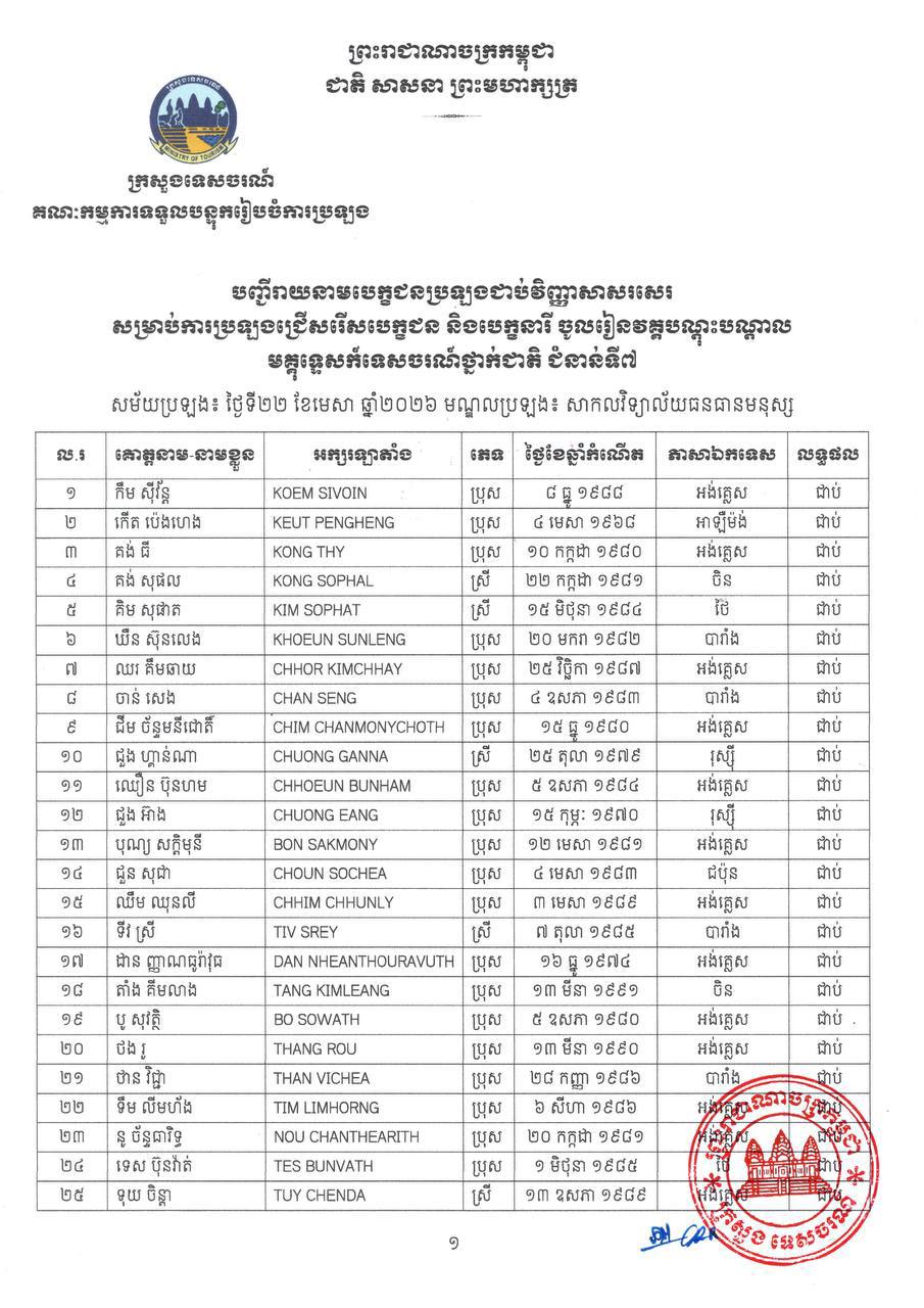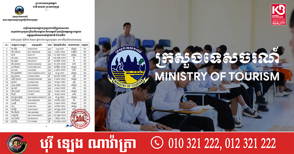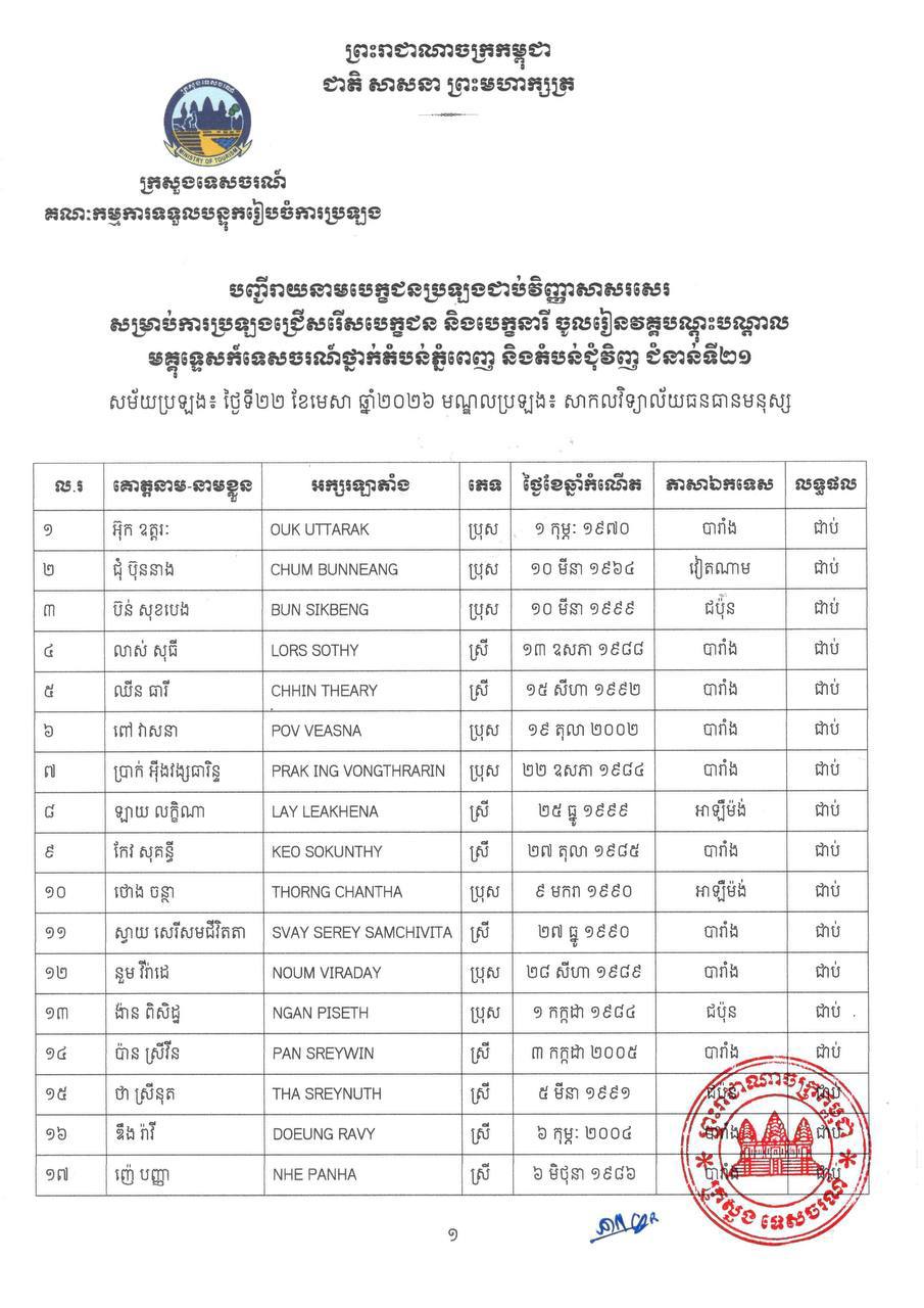 ក្រសួងទេសចរណ៍ ប្រកាសលទ្ធផលជាប់វិញ្ញាសាសរសេរ ប្រឡងមគ្គុទ្ទេសក៍ទេសចរណ៍ថ្នាក់ជាតិ និងថ្នាក់តំបន់ ឆ្នាំ២០២៦