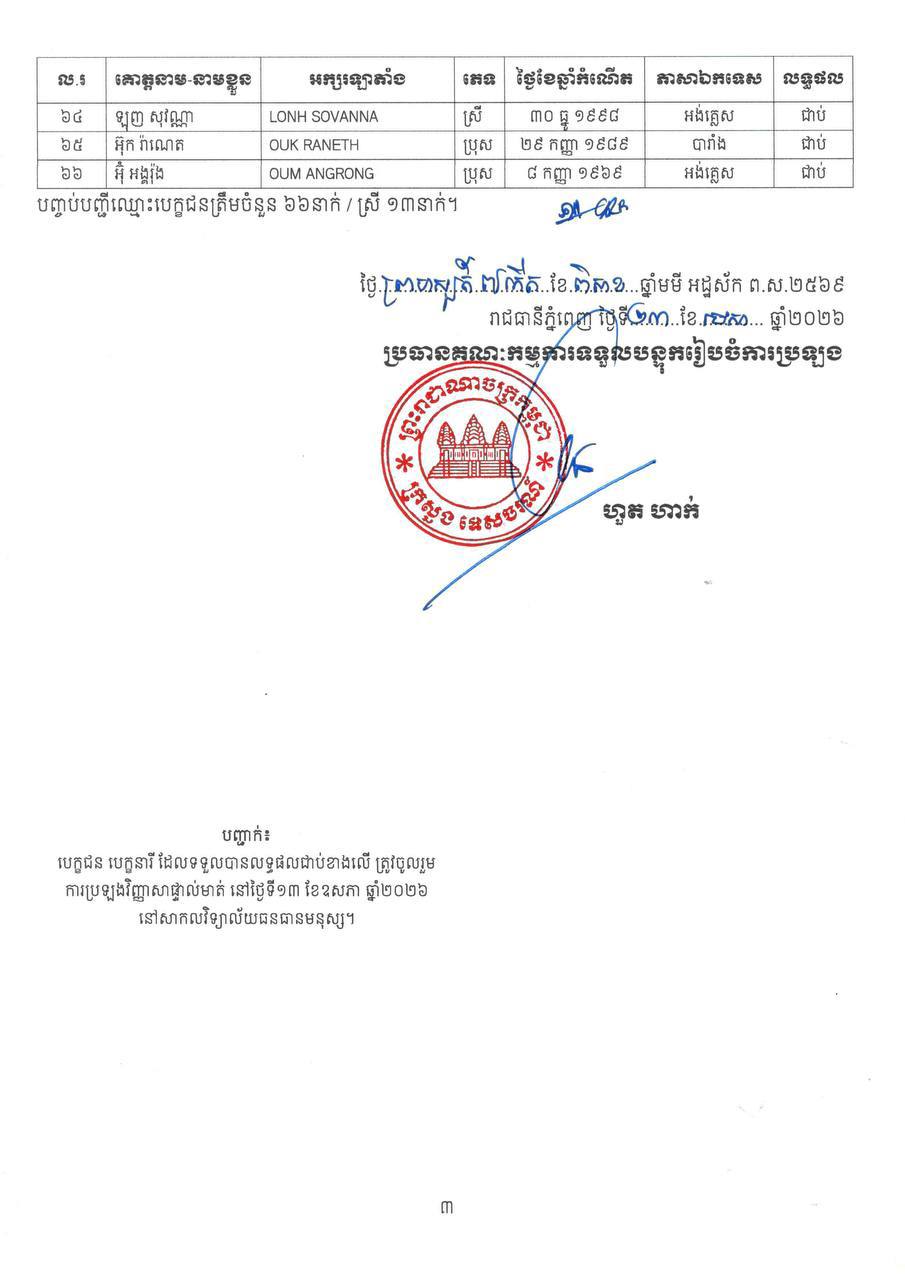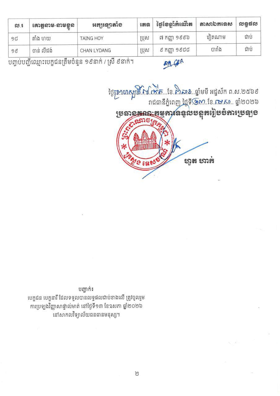 សូមជម្រាបថា បេក្ខជន បេក្ខនារី ត្រូវត្រៀមខ្លួនចូលរួមប្រឡងវិញ្ញាសាផ្ទាល់មាត់ (សម្ភាសន៍) នៅថ្ងៃទី១៣ ខែឧសភា ឆ្នាំ២០២៦ ដើម្បីទទួលបានលទ្ធផលជាប់ស្ថាពរ។ ក្នុងករណី បេក្ខជន បេក្ខនារី ខកខានមិនបានមកប្រឡងវិញ្ញាសាផ្ទាល់មាត់ គណៈកម្មការប្រឡង សូមចាត់ទុកលទ្ធផលប្រឡងវិញ្ញាសាសរសេររបស់បេក្ខជន បេក្ខនារី ជាមោឃៈ ឬស្មើនឹងបោះបង់ការប្រឡង៕