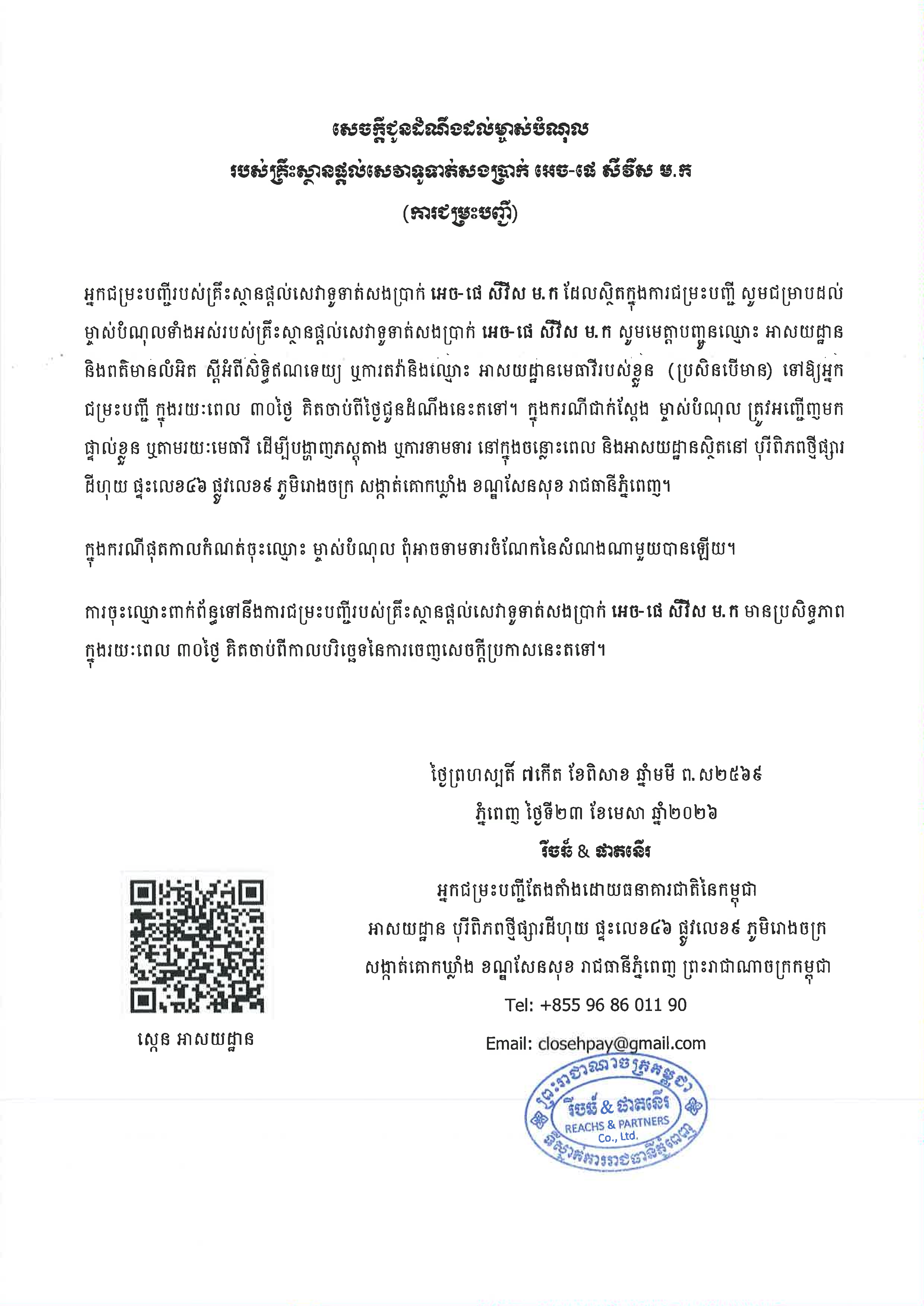 (ភ្នំពេញ)៖ សេចក្តីជូនដំណឹងស្តីពីការជម្រះបញ្ជីគ្រឹះស្ថានផ្តល់សេវាទូទាត់សងប្រាក់ អេច-ផេ សឺវីស ម.ក និងជម្រាបជូនម្ចាស់បំណុលទាំងអស់របស់គ្រឹះស្ថាន អេច-ផេ សឺវីស ម.ក ឱ្យដាក់ពាក្យទាមទារបំណុលយ៉ាងយូរត្រឹមថ្ងៃទី២៤ ខែឧសភា ឆ្នាំ២០២៦។