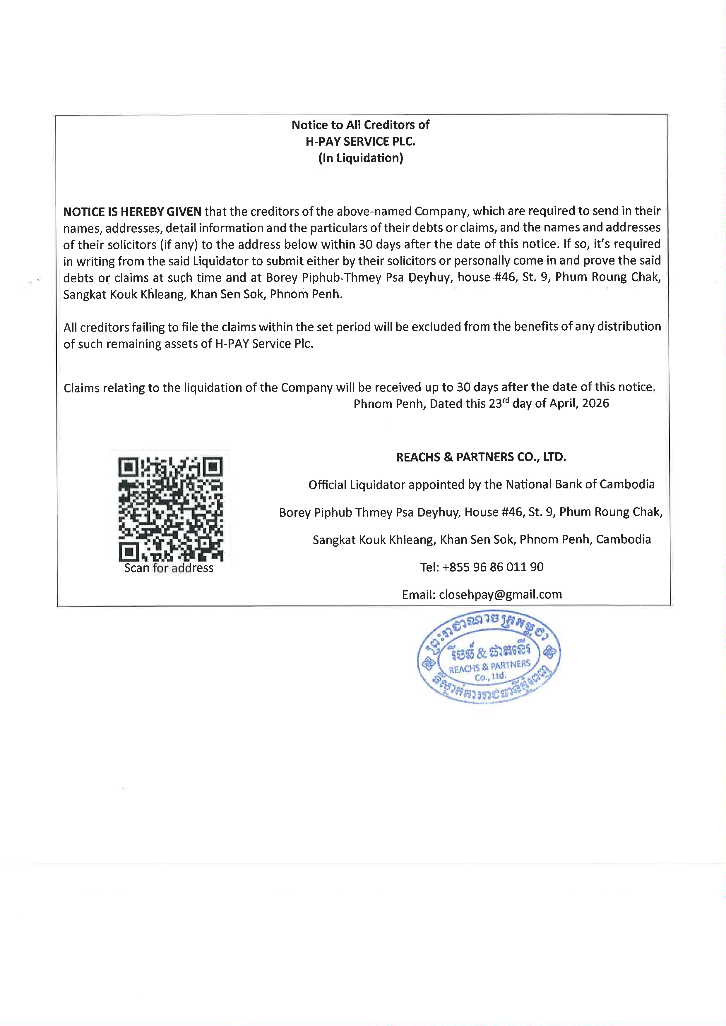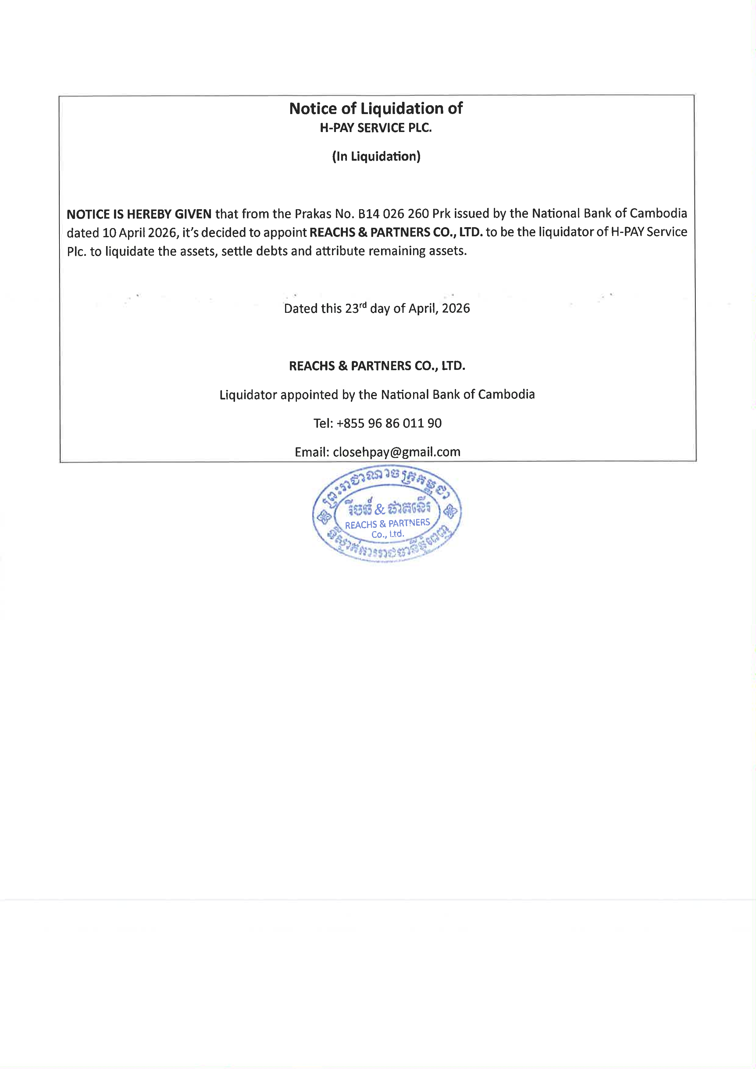 សេចក្តីជូនដំណឹងស្តីពីការជម្រះបញ្ជីរបស់គ្រឹះស្ថានផ្តល់សេវាទូទាត់សងប្រាក់ អេច-ផេ សឺវីស និងជូនដំណឹងឲ្យម្ចាស់បំណុលដាក់ពាក្យទាមទារបំណុល