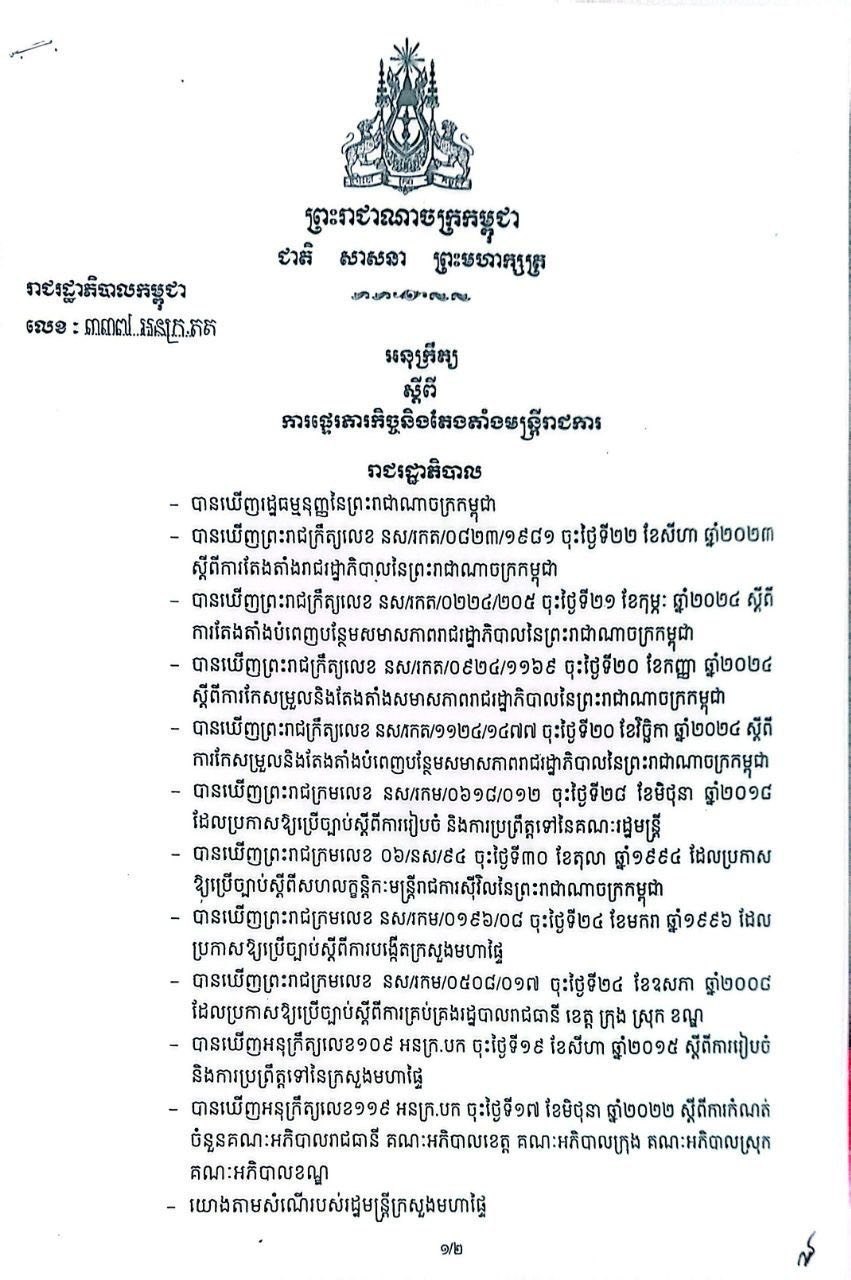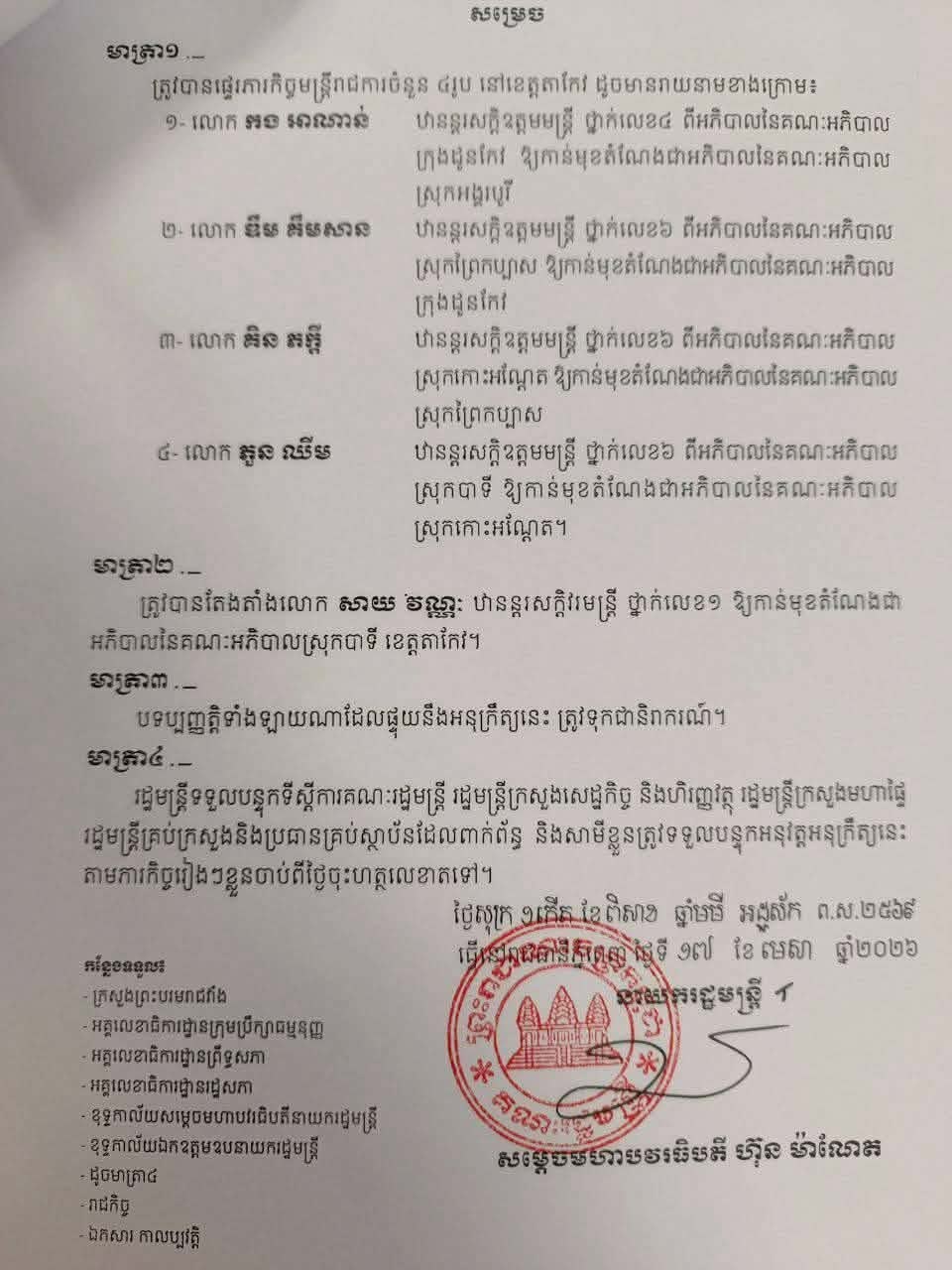 តាមអនុក្រឹត្យដែលបណ្តាញព័ត៌មាន Fresh News ទទួលបាននៅថ្ងៃទី២៤ ខែមេសានេះសម្រេច៖