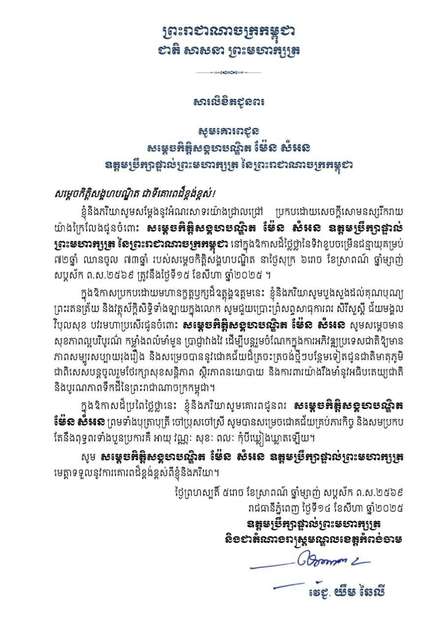 (ភ្នំពេញ)៖ ឯកឧត្តម យឹម ឆៃលី ឧត្តមប្រឹក្សាផ្ទាល់ព្រះមហាក្សត្រ និងជាតំណាងរាស្រ្តមណ្ឌលខេត្តកំពង់ចាម បានផ្ញើសារជូនពរ សម្ដេចកិត្តិសង្គហបណ្ឌិត ម៉ែន សំអន ឧត្តមប្រឹក្សាផ្ទាល់ព្រះមហាក្សត្រ នៃព្រះរាជាណាចក្រកម្ពុជា ក្នុងឱកាសជ័យមង្គល នៃខួបកំណើតរបស់សម្តេចកិត្តិសង្គបណ្ឌិត គម្រប់៧២ឆ្នាំ ឈានចូល ៧៣ឆ្នាំ នាថ្ងៃសុក្រ ៦រោច ខែស្រាពណ៍ ត្រូវនឹងថ្ងៃទី១៥ ខែសីហា ឆ្នាំ២០២៥។
