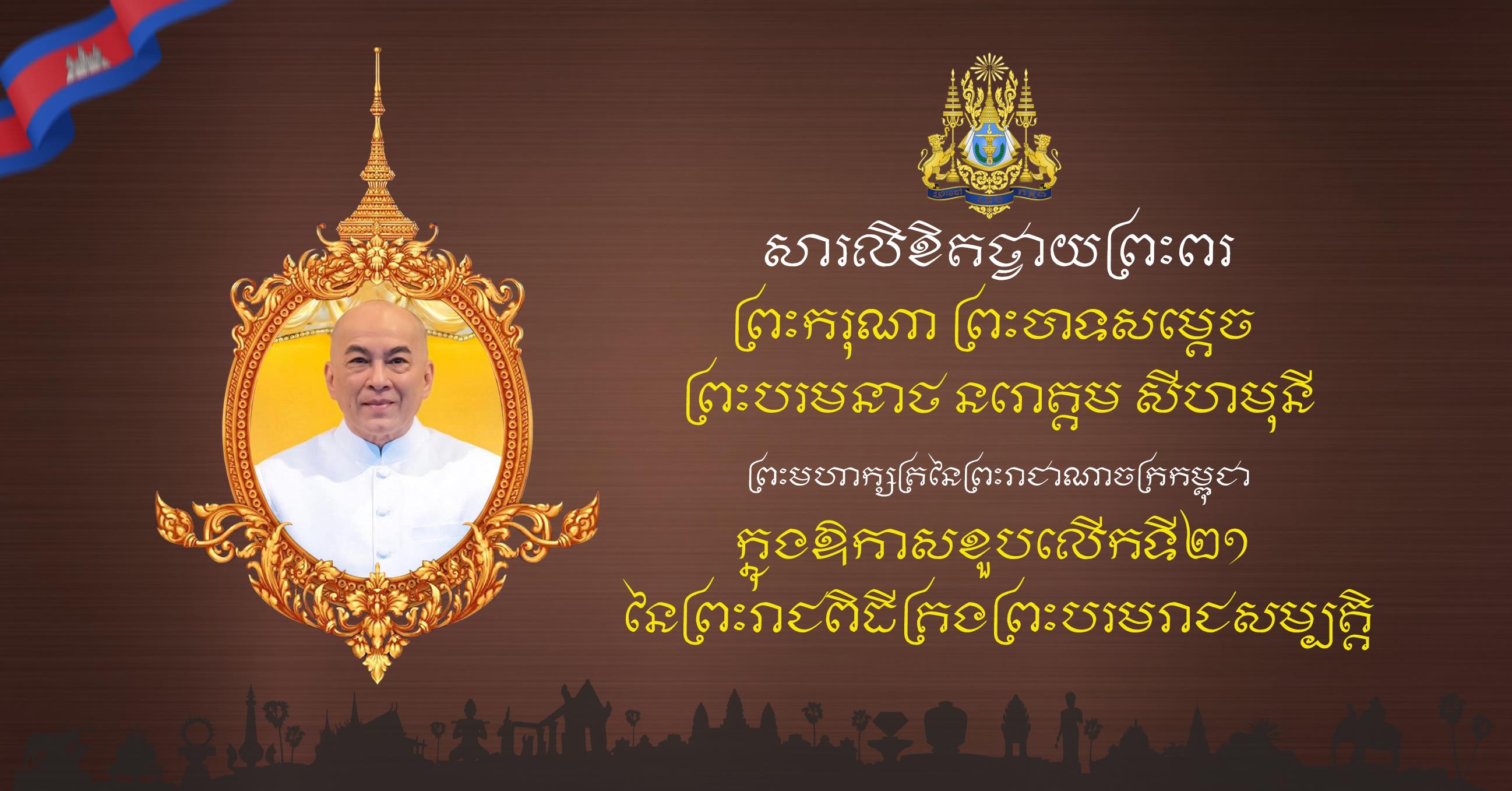 (ភ្នំពេញ)៖ ក្នុងឱកាសដ៏មហានក្ខត្តឫក្ស សិរីសួស្តី ជ័យមង្គល ប្រសើរថ្លៃថ្លា ឧត្តុង្គឧត្តមប្រកបដោយសេចក្តីសោមនស្សរីករាយ ខួបលើកទី២១ នៃព្រះរាជពិធីគ្រងព្រះបរមរាជសម្បត្តិ របស់ព្រះករុណា ព្រះបាទសម្តេច ព្រះបរមនាថ នរោត្តម សីហមុនី ព្រះមហាក្សត្រនៃព្រះរាជាណាចក្រកម្ពុជា ជាទីគោរពសក្ការៈដ៏ខ្ពង់ខ្ពស់បំផុត ដែលប្រព្រឹត្តទៅនៅថ្ងៃពុធ ៨កើត ខែកត្តិក ឆ្នាំម្សាញ់ សប្តស័ក ព.ស.២៥៦៩ ត្រូវនឹងថ្ងៃទី២៩ ខែតុលា ឆ្នាំ២០២៥,