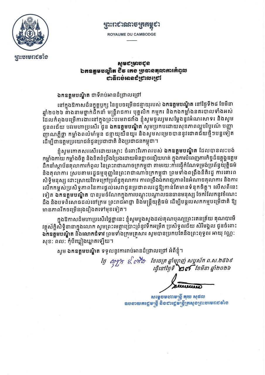 (ភ្នំពេញ)៖ សម្តេចមហាមន្ត្រី គុយ សុផល ឧបនាយករដ្ឋមន្ត្រី និងជារដ្ឋមន្ត្រីក្រសួងព្រះបរមរាជវាំង បានផ្ញើសារលិខិតជូនពរ ឯកឧត្តមបណ្ឌិត ជីវ កេង ប្រធានតុលាការកំពូល នៃព្រះរាជាណាចក្រកម្ពុជា ក្នុងឱកាសដ៏បវរសួស្តី សិរីមង្គលមហាប្រសើរ នៃពិធីចម្រើនជន្មាយុ ដែលប្រព្រឹត្តទៅនៅថ្ងៃសៅរ៍ ១០កើត ខែចេត្រ ឆ្នាំម្សាញ់ សប្តស័ក ពុទ្ធសករាជ ២៥៦៩ ត្រូវនឹងថ្ងៃទី២៨ ខែមីនា ឆ្នាំ២០២៦។