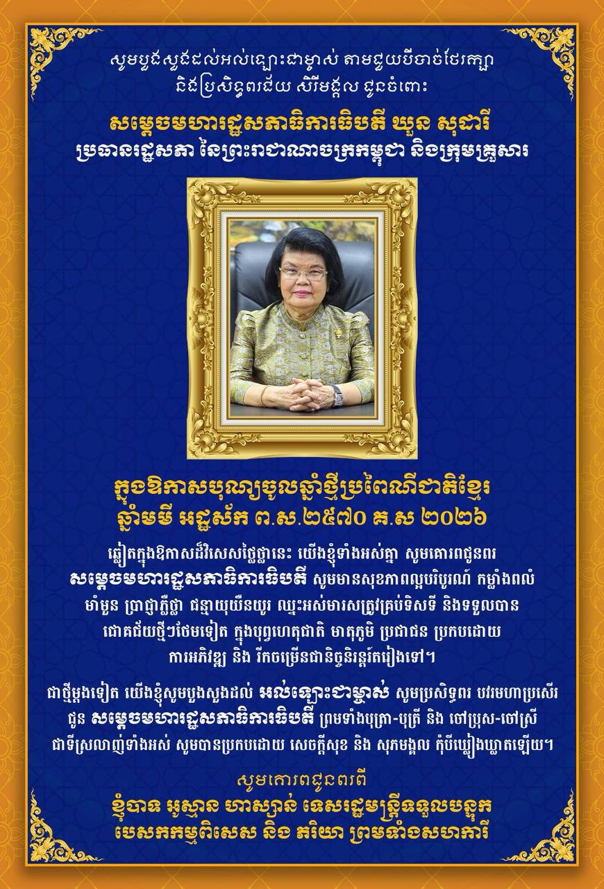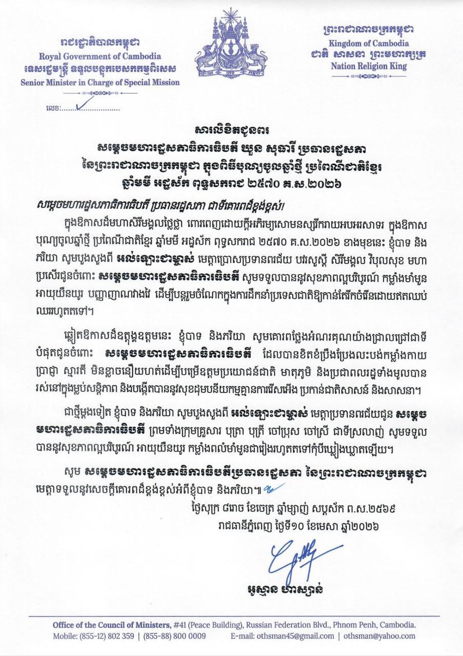 ក្នុងឱកាសដ៏មហាសិរីមង្គលថ្លៃថ្លា ពោរពេញដោយក្តីអភិរម្យសោមនស្សរីករាយអបអរសាទរ ក្នុងឱកាស បុណ្យចូលឆ្នាំថ្មី ប្រពៃណីជាតិខ្មែរ ឆ្នាំមមី អដ្ឋស័ក ពុទ្ធសករាជ ២៥៧០ គ.ស.២០២៦ នេះ ខ្ញុំបាទ និង ភរិយា សូមបួងសួងពី អល់ឡោះជាម្ចាស់ មេត្តាប្រោសប្រទានពរជ័យ បវរសួស្តី សិរីមង្គល វិបុលសុខ មហា ប្រសើរជូនចំពោះ សម្តេចមហារដ្ឋសភាធិការធិបតី សូមទទួលបាននូវសុខភាពល្អបរិបូរណ៍ កម្លាំងមាំមួន អាយុយឺនយូរ បញ្ញាញាណវាងវៃ ដើម្បីបន្តរួមចំណែកក្នុងការដឹកនាំប្រទេសជាតិឱ្យកាន់តែរីកចំរើនដោយឥតឈប់ ឈររហូតតទៅ។