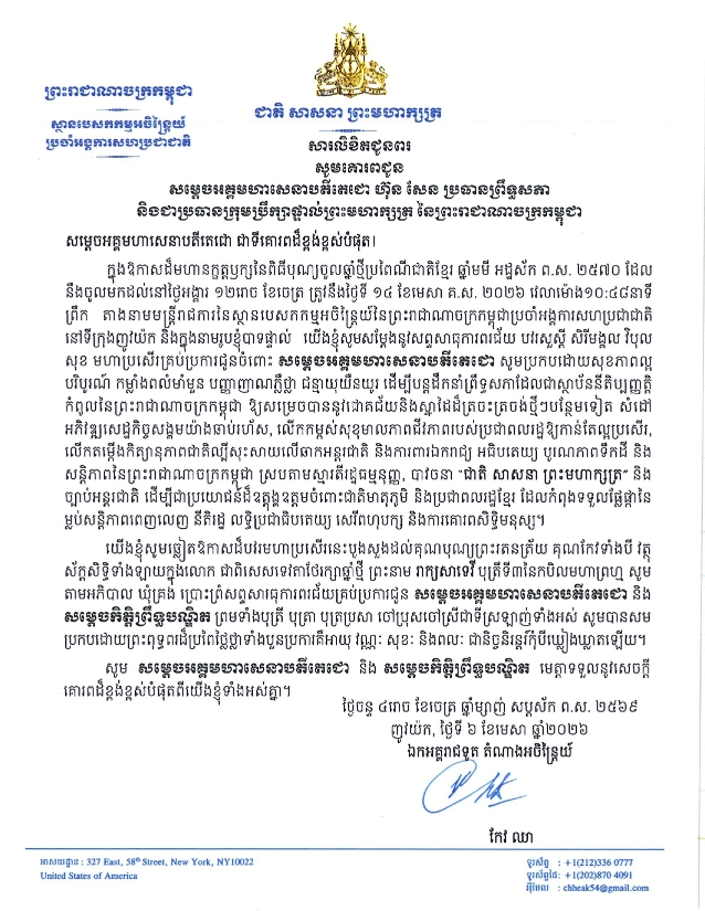(ភ្នំពេញ)៖ ឯកឧត្តម កែវ ឈា ឯកអគ្គរាជទូត និងជាតំណាងអចិន្ត្រៃយ៍កម្ពុជា ប្រចាំអង្គការសហប្រជាជាតិ (អ.ស.ប) ព្រមទាំងថ្នាក់ដឹកនាំ និងមន្ត្រីរាជការនៃ តំណាងអចិន្ត្រៃយ៍កម្ពុជា ប្រចាំអង្គការសហប្រជាជាតិទាំងអស់ សូមផ្ញើសារលិខិតគោរពជូនពរ សម្ដេចអគ្គមហាសេនាបតីតេជោ ហ៊ុន សែន ប្រធានព្រឹទ្ធសភាពនៃកម្ពុជា និងសម្ដេចកិត្តិព្រឹទ្ធបណ្ឌិត ប៊ុន រ៉ានី ហ៊ុនសែន ប្រធានកាកបាទក្រហមកម្ពុជា នៅក្នុងឱកាសពិធីបុណ្យចូលឆ្នាំថ្មី ប្រពៃណីជាតិខ្មែរ ឆ្នាំមមី អដ្ឋស័ក ពុទ្ធសករាជ ២៥៦៩។