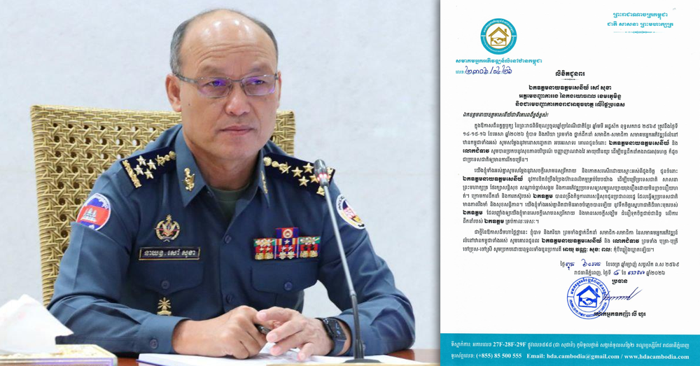(ភ្នំពេញ)៖ លោកអ្នកឧកញ៉ា លី ហួរ ព្រមទាំងថ្នាក់ដឹកនាំ សមាជិក-សមាជិកា នៃសមាគមអ្នកអភិវឌ្ឍន៍លំនៅឋានកម្ពុជាទាំងអស់ សូមផ្ញើសារលិខិតគោរពជូនពរ ឯកឧត្តមនាយឧត្តមសេនីយ៍ សៅ សុខា អគ្គមេបញ្ជាការរង នៃកងយោធពល ខេមរភូមិន្ទ និងជាមេបញ្ជាការកងរាជអាវុធហត្ថ លើផ្ទៃប្រទេស និងលោកជំទាវ នៅក្នុងឱកាសពិធីបុណ្យចូលឆ្នាំថ្មី ប្រពៃណីជាតិខ្មែរ ឆ្នាំមមី អដ្ឋស័ក ពុទ្ធសករាជ ២៥៦៩។