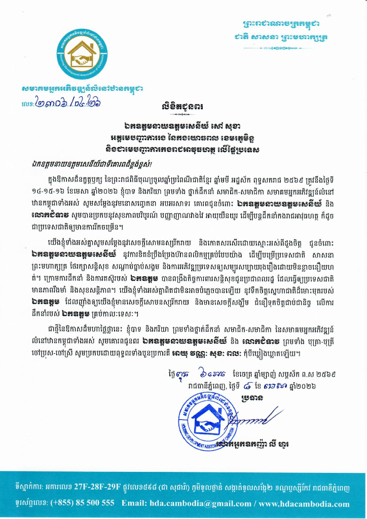 ជាថ្មីនៃឱកាសដ៏មហាថ្លៃថ្លានេះ ខ្ញុំបាទ និងភរិយា ព្រមទាំងថ្នាក់ដឹកនាំ សមាជិក-សមាជិកា នៃសមាគមអ្នកអភិវឌ្ឍន៍ លំនៅឋានកម្ពុជាទាំងអស់ សូមគោរពជូនពរ ឯកឧត្ដមនាយឧត្ដមសេនីយ៍ និង លោកជំទាវ ព្រមទាំង បុត្រា-បុត្រី ចៅប្រុស-ចៅស្រី សូមប្រកបដោយពុទ្ធពរទាំងបួនប្រការគឺ អាយុ វណ្ណៈ សុខៈ ពលៈ កុំបីឃ្លៀងឃ្លាតឡើយ។