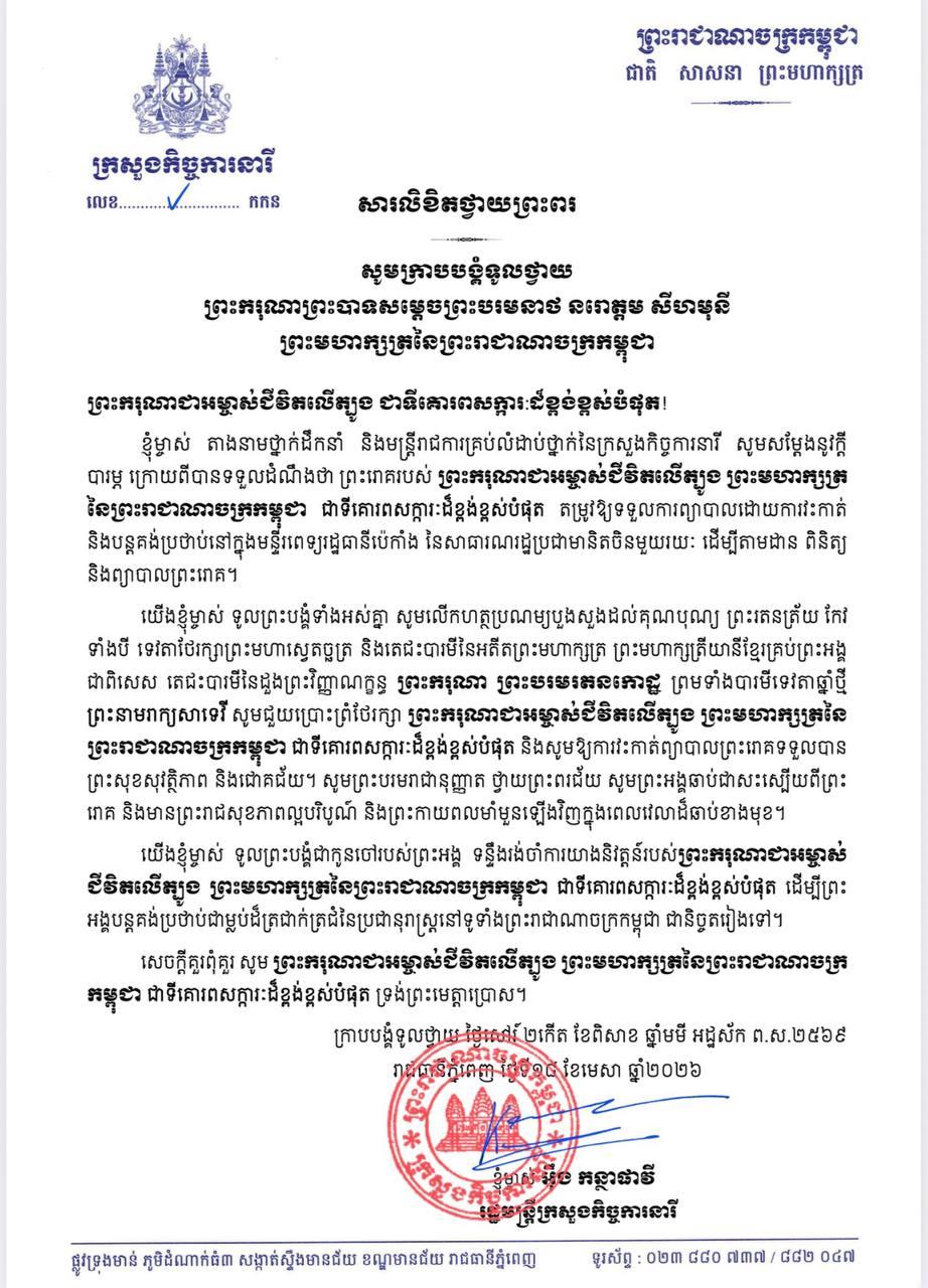 ទូលព្រះបង្គំជាខ្ញុំ សូមសម្តែងនូវក្តីបារម្ភ ក្រោយពីទទួលព័ត៌មានថា ព្រះរោគមហារីកក្រពេញប្រូស្តាត (prostate cancer) របស់ព្រះករុណា ជាអម្ចាស់ជីវិតលើត្បូង ជាទីគោរពសក្ការៈដ៏ខ្ពង់ខ្ពស់បំផុត តម្រូវឱ្យព្រះអង្គទទួលការព្យាបាលដោយការវះកាត់តាមវេជ្ជបញ្ជា នៅមន្ទីរពេទ្យនារដ្ឋធានីប៉េកាំង នៃសាធារណរដ្ឋប្រជាមានិតចិន និងបន្តគង់ប្រថាប់នៅទីនោះមួយរយៈពេល ដើម្បីតាមដានត្រួតពិនិត្យ និងព្យាបាលព្រះរោគ ចាប់ពីថ្ងៃទី១៨ ខែមេសា ឆ្នាំ២០២៦នេះ។