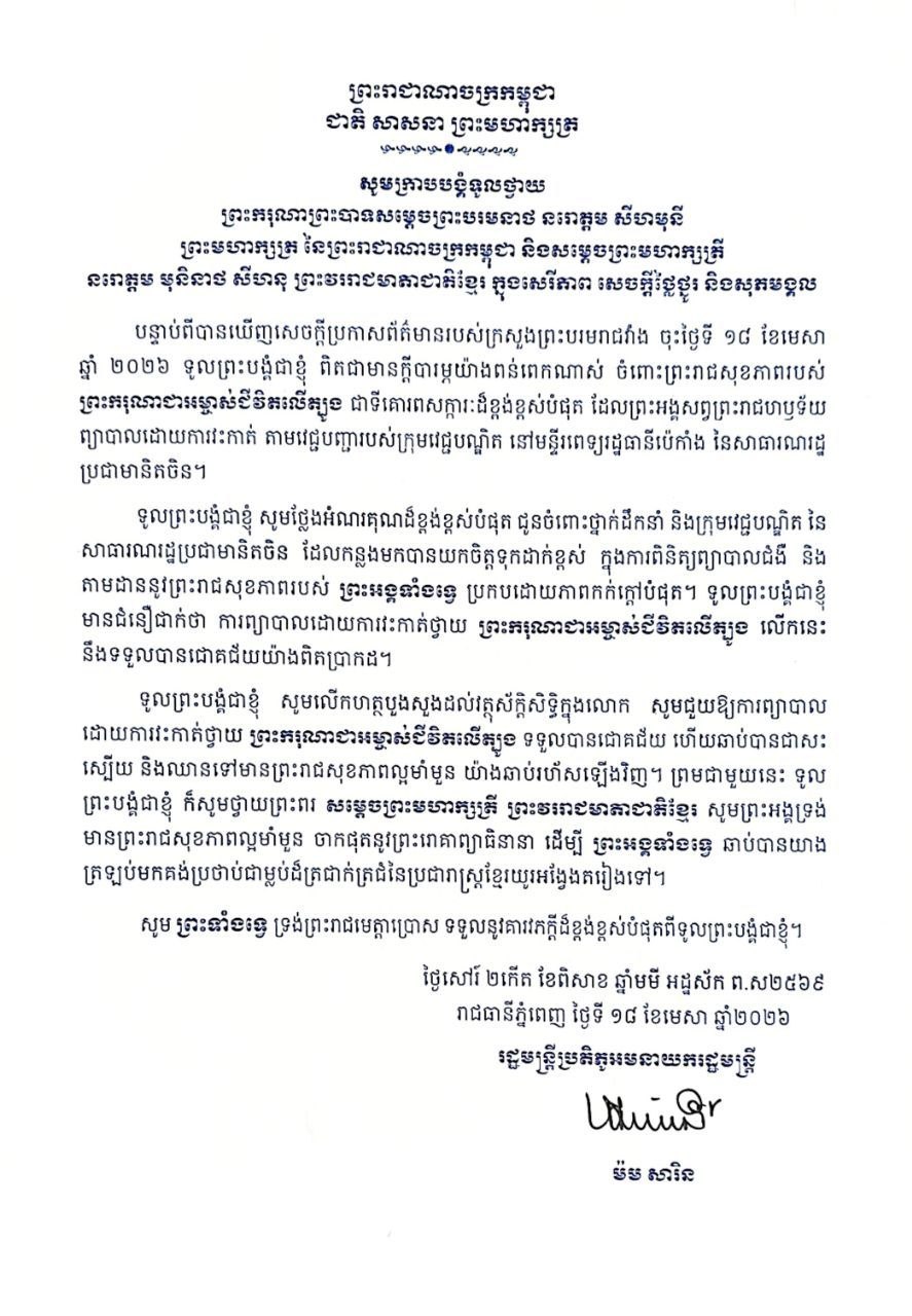 ទូលព្រះបង្គំជាខ្ញុំ សូមសម្តែងនូវក្តីបារម្ភ ក្រោយពីទទួលព័ត៌មានថា ព្រះរោគមហារីកក្រពេញប្រូស្តាត (prostate cancer) របស់ព្រះករុណា ជាអម្ចាស់ជីវិតលើត្បូង ជាទីគោរពសក្ការៈដ៏ខ្ពង់ខ្ពស់បំផុត តម្រូវឱ្យព្រះអង្គទទួលការព្យាបាលដោយការវះកាត់តាមវេជ្ជបញ្ជា នៅមន្ទីរពេទ្យនារដ្ឋធានីប៉េកាំង នៃសាធារណរដ្ឋប្រជាមានិតចិន និងបន្តគង់ប្រថាប់នៅទីនោះមួយរយៈពេល ដើម្បីតាមដានត្រួតពិនិត្យ និងព្យាបាលព្រះរោគ ចាប់ពីថ្ងៃទី១៨ ខែមេសា ឆ្នាំ២០២៦នេះ។