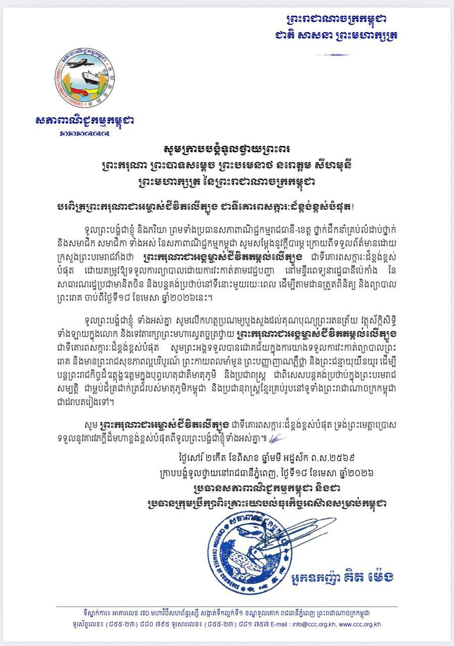 (ភ្នំពេញ)៖ ទូលព្រះបង្គំ គិត ម៉េង ប្រធានសភាពាណិជ្ជកម្មកម្ពុជា និងលោកជំទាវ ម៉ៅ ចំណាន សូមក្រាបបង្គំទូលថ្វាយព្រះពរ ព្រះករុណា ព្រះបាទសម្តេចព្រះបរមនាថ នរោត្តម សីហមុនី ព្រះមហាក្សត្រ នៃព្រះរាជាណាចក្រកម្ពុជា ឆាប់បានជាសះស្បើយ ពីព្រះរោគមហារីកក្រពេញប្រូស្តាត (prostate cancer) ដែលនឹងព្យាបាលដោយវះកាត់ នៅក្នុងមន្ទីរពេទ្យរដ្ឋធានីប៉េកាំង នៃសាធារណរដ្ឋប្រជាមានិតចិន។