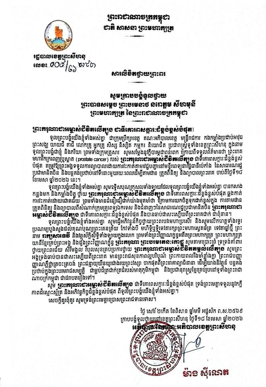 ទូលព្រះបង្គំជាខ្ញុំ សូមសម្តែងនូវក្តីបារម្ភ ក្រោយពីទទួលព័ត៌មានថា ព្រះរោគមហារីកក្រពេញប្រូស្តាត (prostate cancer) របស់ព្រះករុណា ជាអម្ចាស់ជីវិតលើត្បូង ជាទីគោរពសក្ការៈដ៏ខ្ពង់ខ្ពស់បំផុត តម្រូវឱ្យព្រះអង្គទទួលការព្យាបាលដោយការវះកាត់តាមវេជ្ជបញ្ជា នៅមន្ទីរពេទ្យនារដ្ឋធានីប៉េកាំង នៃសាធារណរដ្ឋប្រជាមានិតចិន និងបន្តគង់ប្រថាប់នៅទីនោះមួយរយៈពេល ដើម្បីតាមដានត្រួតពិនិត្យ និងព្យាបាលព្រះរោគ ចាប់ពីថ្ងៃទី១៨ ខែមេសា ឆ្នាំ២០២៦នេះ។